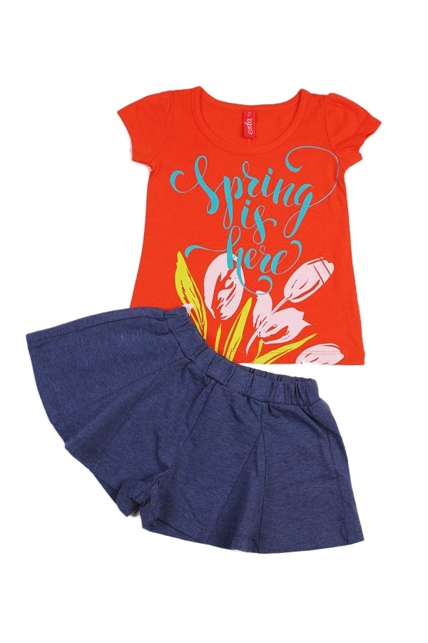 Красивый и стильный летний наряд для маленькой принцессы. Комплект состоит из футболки оранжевого цвета, с ярким прнтом и однотонных, серых шортиков (форма клеш). Пояс резинка. Материал 100% хлопок. У... Показать описаниедобный вариант для прогулок, дома и детского сада. Материал: 100% хлопок. Больше картинок и таблица размеров на странице.