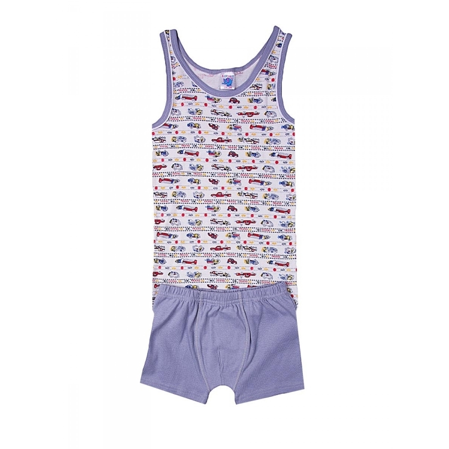 Комплект для мальчика, состоящий из классической майки и трусиков-боксеров. Майка: прямой крой, глубокий вырез горловины. Цвет белый, вырез горловины и пройма отделаны серой бейкой. Майка украшена при... Показать описаниентом с изображением машинок (по всему изделию). Трусики: облегающие тело боксеры на резинке, цвет серый, без рисунков и надписей. Материал 100% хлопок. Удобный, не сковывающий движений вариант на каждый день. Материал: 100% хлопок. Больше картинок и таблица размеров на странице.