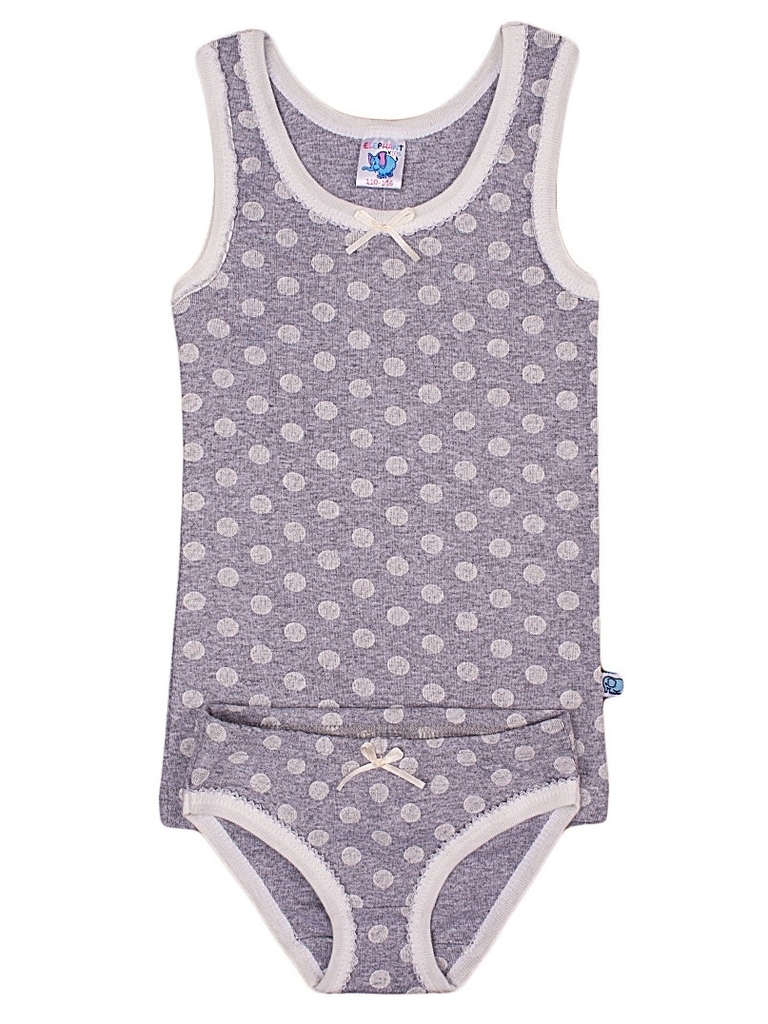 Комплект хлопкового нижнего белья для девочки, состоящий из длинной прямой майки и трусиков классического кроя. Цвет комплекта серый с принтом в виде белых горошин (по всему изделию). Вырез горловины,... Показать описание проймы на майке, а также прорезь для ног на трусиках отделаны белой бейкой. Также на горловине и поясе-резинке есть небольшие бантики из белой шелковой ленты. Материал 100% хлопок, благодаря чему этот комплект может стать частью комфортного повседневного гардероба. Материал: 100% хлопок. Больше картинок и таблица размеров на странице.