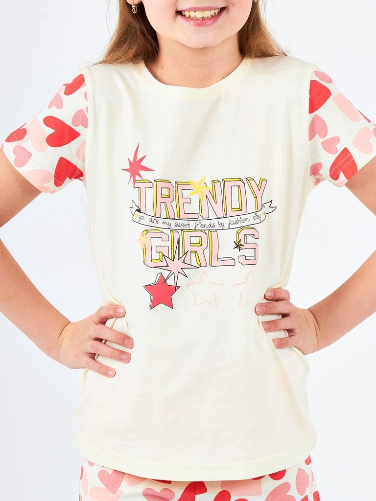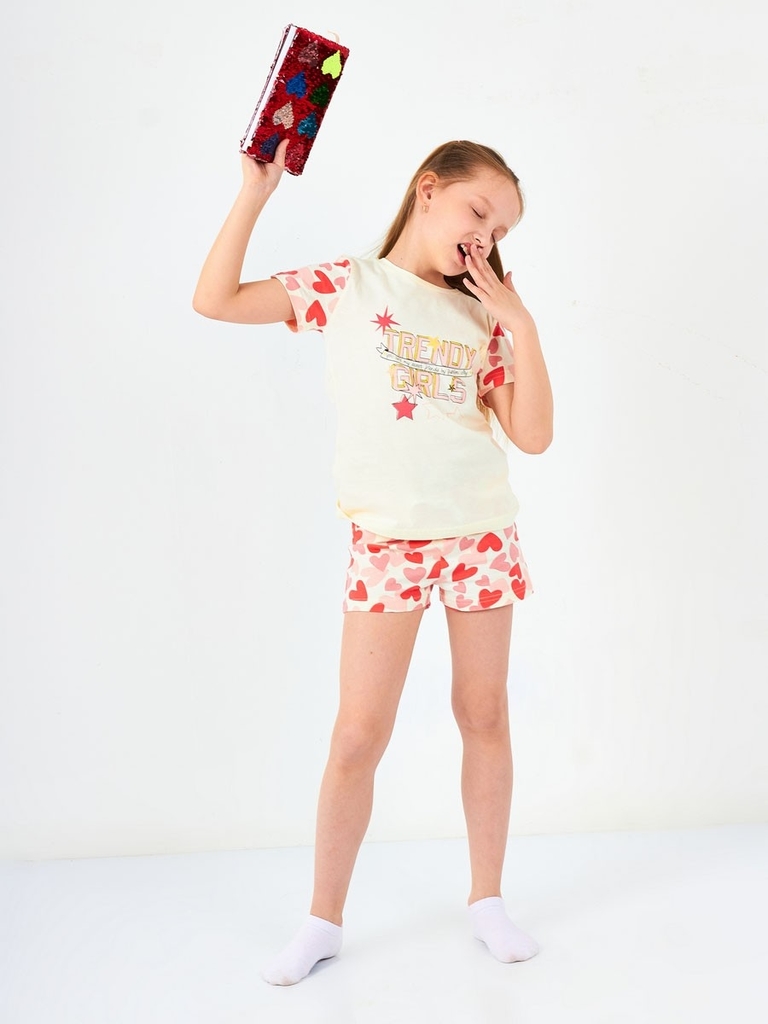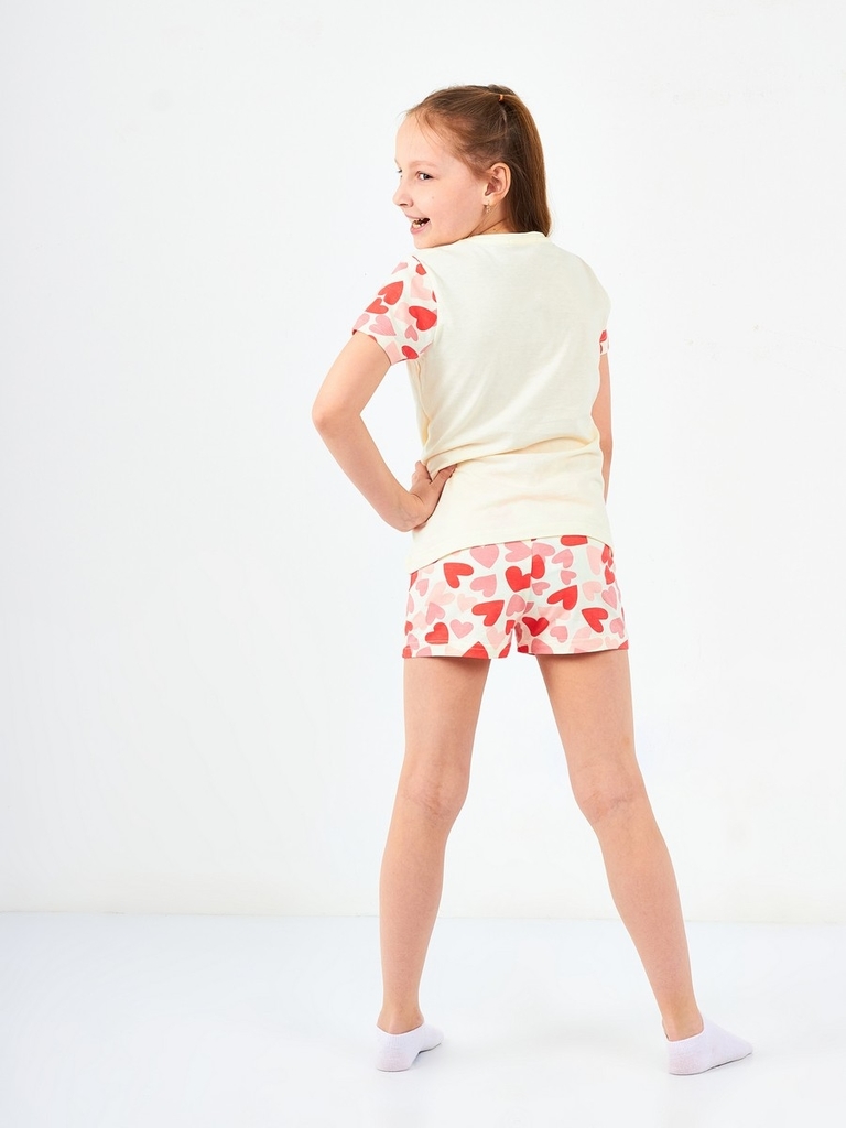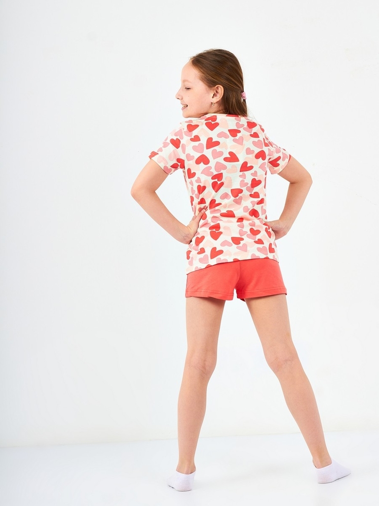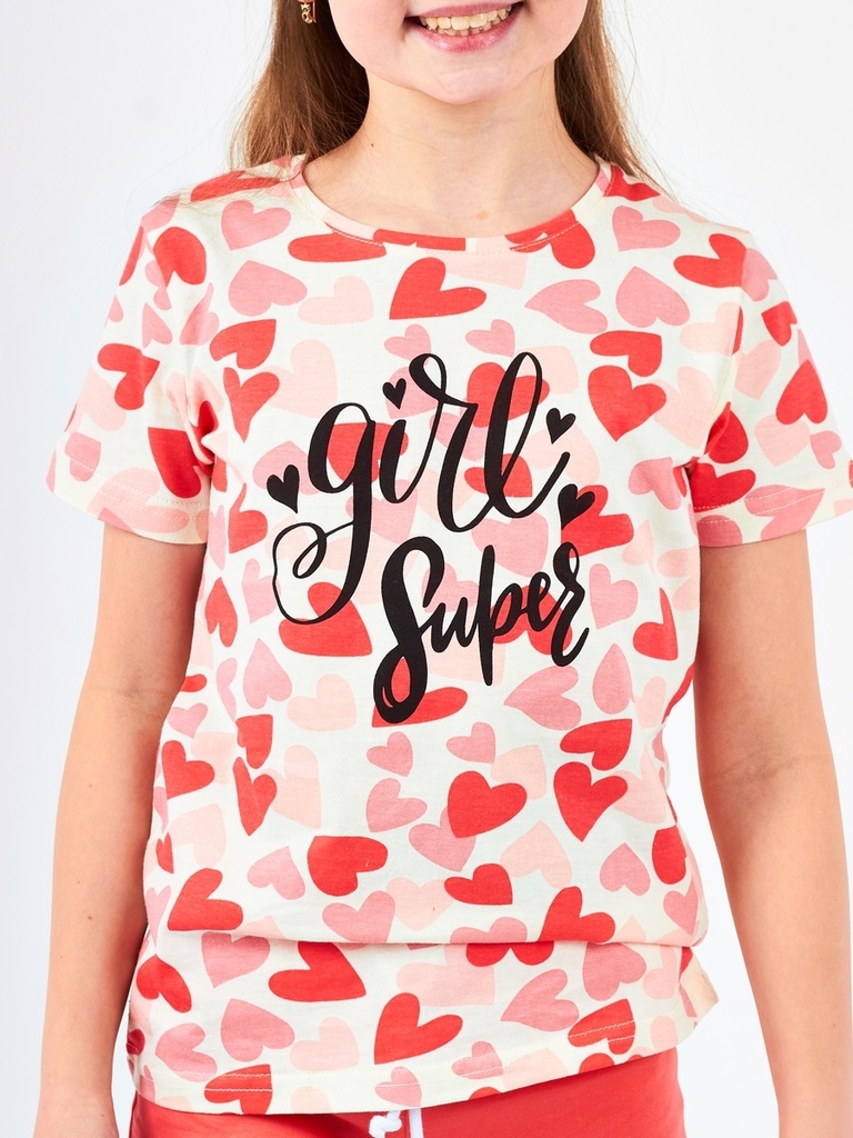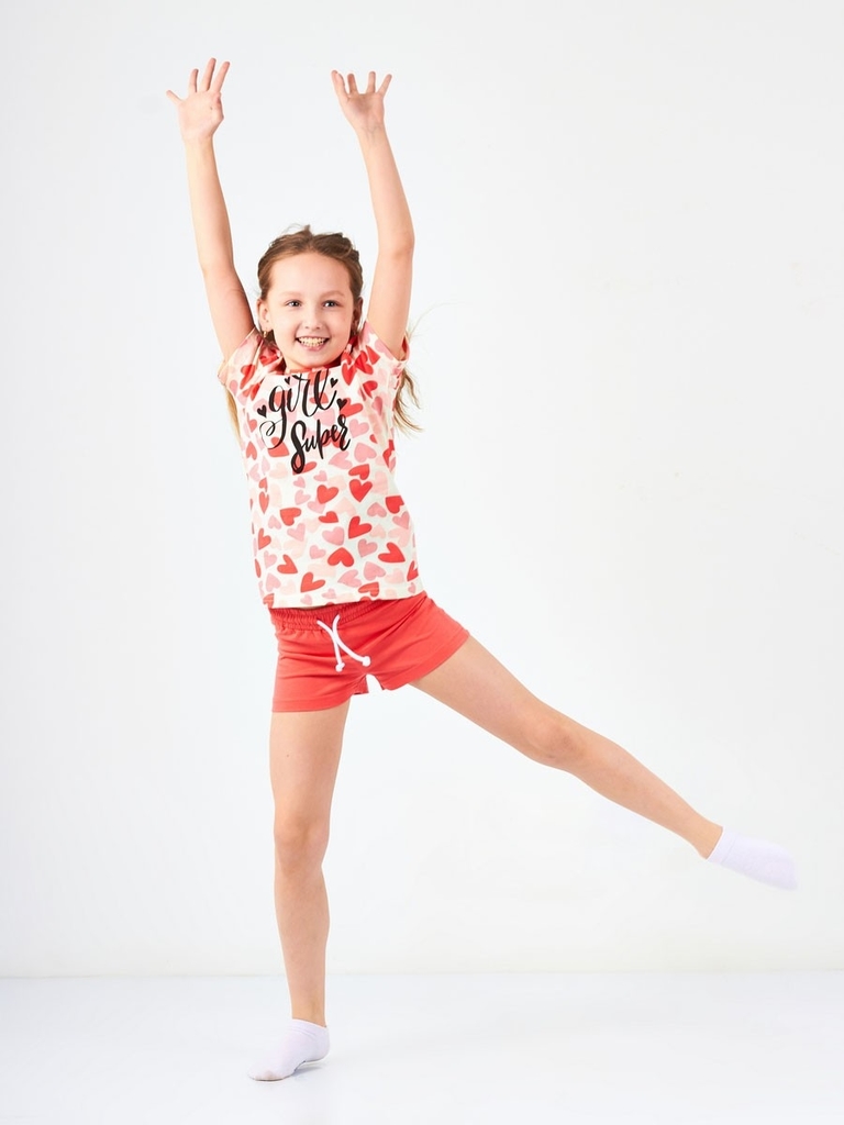 Цвет изделия комбинированный- молочный/коралловый с рисунком на футболке (набивка сердце). Тип ткани-Кулирная гладь (супрем). Материал: 100% хлопок. Больше картинок и таблица размеров на странице.