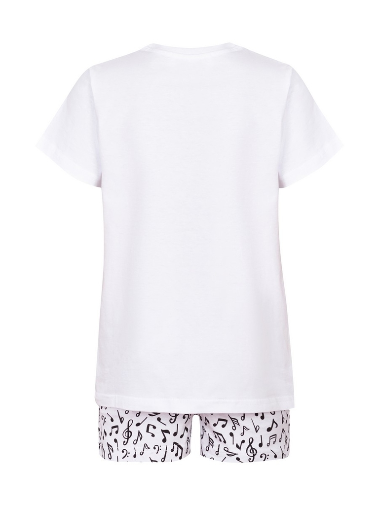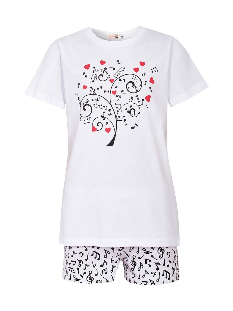 Футболка-крой прямой, рукава короткие, вырез горловины округлый, неглубокий. Шорты-длина выше колена, пояс на резинке. Цвет изделия-белый, с принтом (набивка ноты). Тип ткани-Кулирная гладь (супрем). ... Показать описаниеМатериал: 100% Хлопок. Больше картинок и таблица размеров на странице.