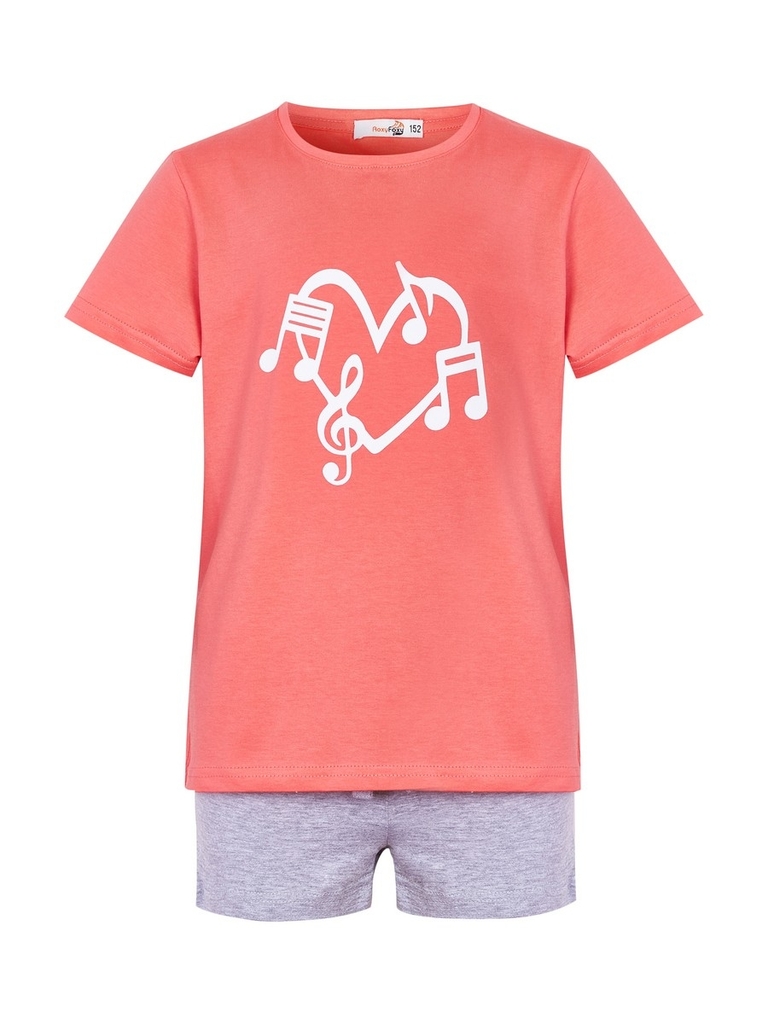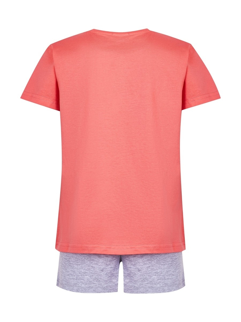 Футболка-крой прямой, рукава короткие, вырез горловины округлый, неглубокий. Шорты-длина выше колена, пояс на резинке. Цвет изделия комбинированный-коралловый/серый меланж, с принтом на футболке. Тип ... Показать описаниеткани-Кулирная гладь (супрем). Материал: Верх - 100% Хлоп. Низ - 70% Хлоп. 30% ПЭ. Больше картинок и таблица размеров на странице.