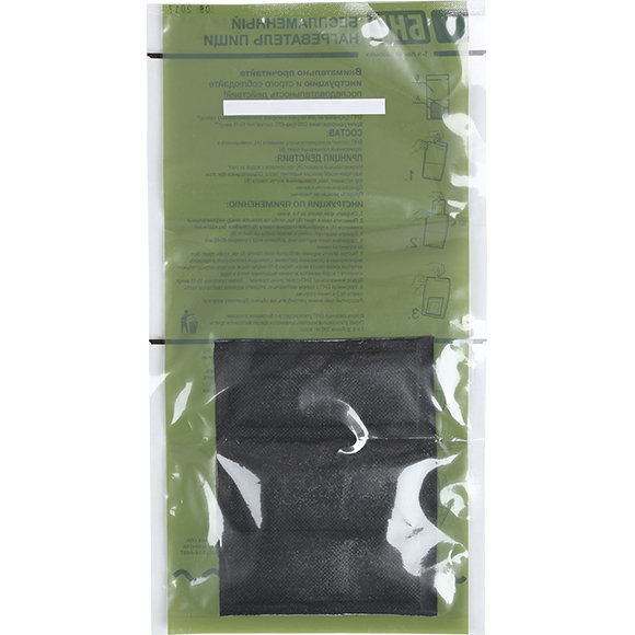 Беспламенный нагреватель пищи БНП представляет собой полимерный пакет, в котором находится нагревательный элемент. Герметично упакованный продукт (банка, ламистер, реторт-пакет) помещаются в пакет, за... Показать описаниетем в пакет добавляется небольшое количество воды (40-45мл). Нагревательный элемент при контакте с водой выделяет тепло (происходит экзотермическая реакция) При этом герметично упакованный продукт нагревается за счет контакта с нагревательным элементом и за счет образующегося пара. Время нагрева герметично упакованного продукта массой 250-300г составляет 12-15 минут. Одноразовое использование. Продукты реакции не токсичны. Инструкция 1. Оторвите край пакета по 1-й линии. 2. Поместите банку (ламистер, реторт-упаковку) в пакет так, чтобы он оказался между нагревательным элементом и прозрачной стороной пакета (стороной без надписей). 3. Удалите защитную пленку с липкой ленты на пакете. 4. Удерживая пакет вертикально, добавьте воду (примерно 40-45 мл) до волнистой линии. 5.Быстро загните верхний свободный край пакета так, чтобы пакет был зафиксирован в сложенном состояние с помощью липкого слоя, и положите загнутым краем пакета вверх. Через 5-10 секунд после контакта нагревательного элемента с водой начнётся активное выделение тепла и пара. Будьте внимательны! БНП станет очень горячим! Время разогрева 10-15 минут. 6. Удерживая БНП с пайком вертикально, оторвите верхнюю свободную часть пакета по 2-й линии разрыва. Извлеките банку (ламистер, реторт-упаковку) из пакета. Разогретую пищу можно употреблять. Приятного аппетита! Использованный БНП утилизируется с бытовыми отходами. Перед утилизацией неиспользованного изделия выполните пункты 1 и 4 добавив 300 мл воды. Обратите внимание: Беспламенный разогреватель пищи БНП используется только для консервов (пайков), предназначенных для разогрева без предварительного вскрытия. Допускается нагревать воду в герметично закрытой фляжке. Если требуется разогреть продукты - консервы, воду - имеющие начальную температуру ниже 0°С можете использовать БНП, поместив предварительно в пакет два нагревательных элемента после чего последовательность действий соответствует пунктам инструкции со 2-го по 6-й. Воды при этом потребуется в 3 раза больше (п.4 инструкции), и время нагрева (п.5 инструкции) увеличится.
