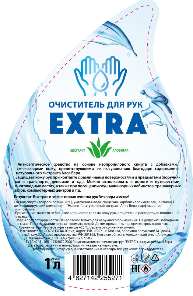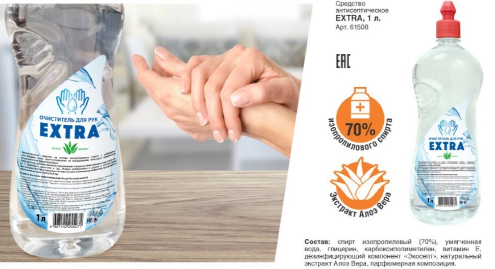 Габариты в упаковке: 25 х 10 х 6 см. Вес: 1 кг Очиститель для рук EXTRA (средство антисептическое для рук)с приятным запахом парфюмерной композиции с экстрактом Алоэ вера. Предназначение: Защищает кож... Показать описаниеу рук при контакте с различными поверхностями и предметами (поручнями в транспорте, деньгами и т.д.). Можно использовать в дороге и путешествии, многолюдных местах, а также при посещении саун, маникюрных кабинетов, тренажерных залов, компьютерных центров и т.д. Состав: спирт изопропиловый (70%), умягченная вода, глицерин, карбоксиполиметилен, витамин Е, дезинфицирующий компонент «Экосепт», натуральный экстракт Алоэ Вера, парфюмерная композиция Срок годности: 36 мес. Условия хранения: При температуре не выше +25гр.С Рекомендации по уходу: антисептическое средство на основе изопропилового спирта с добавками, см.ягчающими кожу, препятствующими ее высушиванию благодаря содержанию натурального экстракта Алоэ Вера.