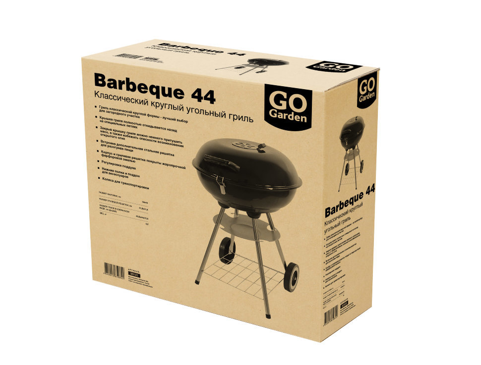 Габариты в упаковке: 45 х 20 х 46 см. Вес: 4.8 кг. Артикул производителя: 50131. Производитель: GO GARDEN. Особенности: на колесах, регулировка подачи воздуха. Тип: гриль. Материал: сталь, термостойки... Показать описанией пластик, жаропрочная фарфоровая эмаль. Гарантия: 6 месяцев. Все размеры: 70,5(Д)*44(Ш)*49,5(В) см. Размер жарочной поверхности- D 44 см. Классический гриль круглой формы максимально удобен и эффективен в приготовлении пищи - мясо, рыбу или овощи можно не просто жарить, но и тушить без опасности возникновения открытого огня, просто закрыв крышку гриля. Супер предложение. * Гриль классической круглой формы лучший выбор для загородного участка. * Крышка гриля полностью откидывается назад на специальных петлях . * Закрыв крышку гриля можно немного притушить мясо, а также избежать опасности возникновения открытого огня. * Встроена дополнительная стальная решетка для разогрева пищи. * Корпус и грилевая решетка покрыты жаропрочной фарфоровой эмалью. * Регулировка поддува. * Нижняя полка и поддон для аксессуаров. * Колеса для транспортировки.