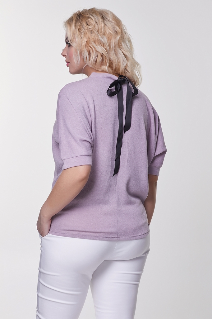 Комфортная блуза прямого силуэта из трикотажного полотна. Короткий рукав летучая мышь оканчивается манжетой. Горловина оформлена воротником стойкой, по которому пропущена репсовая лента, завязывающаяс... Показать описаниея на спинке в эффектный бант. Низ ровный, без разрезов. Длина изделия: 42,44,46,48р - 61см. ; 50,52р - 64см. Длина рукава от горловины: 42 см. Рост фотомодели: 170 см. Размер фотомодели: 48 Ткань: трикотаж.