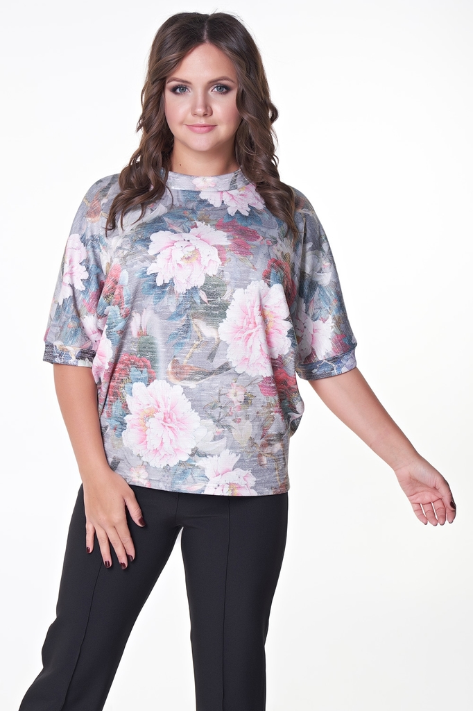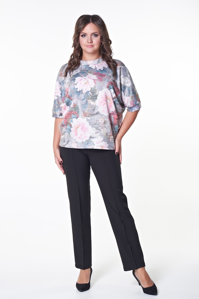 Комфортная блуза прямого силуэта из меланжевого трикотажа с цветочным принтом. Короткий рукав летучая мышь оканчивается манжетой. Горловина оформлена воротником стойкой, по которому пропущена репсовая... Показать описание лента, завязывающаяся на спинке в эффектный бант. Низ ровный, без разрезов. Блузка представлена с брюками Майер №7 Длина изделия: 42,44,46 р - 62 см. ; 48,50,52 р - 64 см. Длина рукава от горловины: 42 см. Рост фотомодели: 173 см. Размер фотомодели: 48. Ткань: трикотаж.