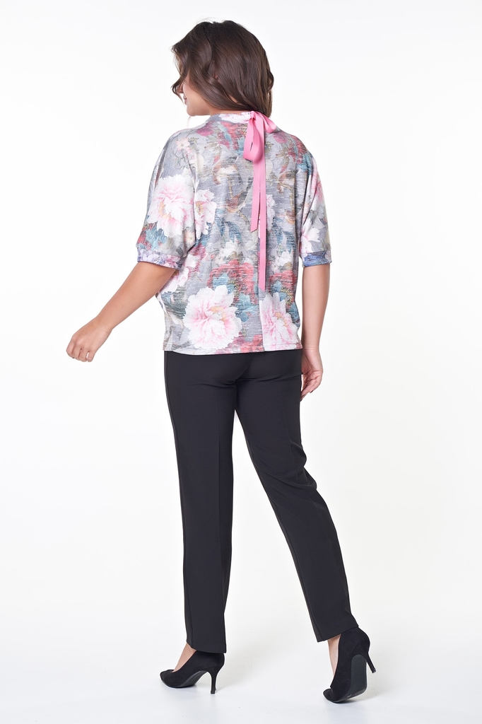 Комфортная блуза прямого силуэта из меланжевого трикотажа с цветочным принтом. Короткий рукав летучая мышь оканчивается манжетой. Горловина оформлена воротником стойкой, по которому пропущена репсовая... Показать описание лента, завязывающаяся на спинке в эффектный бант. Низ ровный, без разрезов. Блузка представлена с брюками Майер №7 Длина изделия: 42,44,46 р - 62 см. ; 48,50,52 р - 64 см. Длина рукава от горловины: 42 см. Рост фотомодели: 173 см. Размер фотомодели: 48. Ткань: трикотаж меланж.