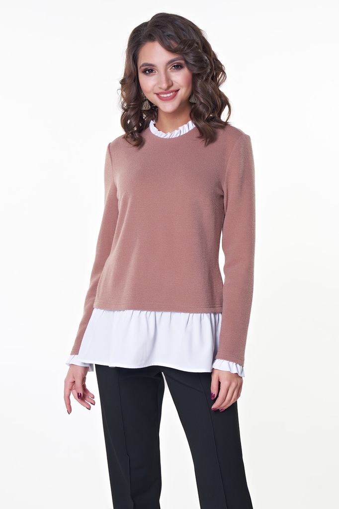 Необычная блуза полуприлегающего силуэта с имитацией рубашки. Втачные длинные рукава снизу оформлены оборкой. Округлая горловина сверху оформлена оборкой. Сзади находится застежка на петлю и пуговицу.... Показать описание Оборки воротника, рукава и нижняя часть изделия выполнены из блузочной ткани. Низ прямой, без разреза. Модель станет прекрасной основой для создания делового образа. Блузка представлена с брюками Майер №7 Длина изделия: 65 см. Длина рукава: 58 см. Рост фотомодели: 170 см. Размер фотомодели: 42. Ткань: Трикотаж, Ниагара.