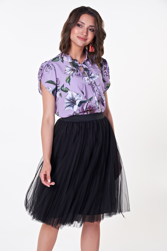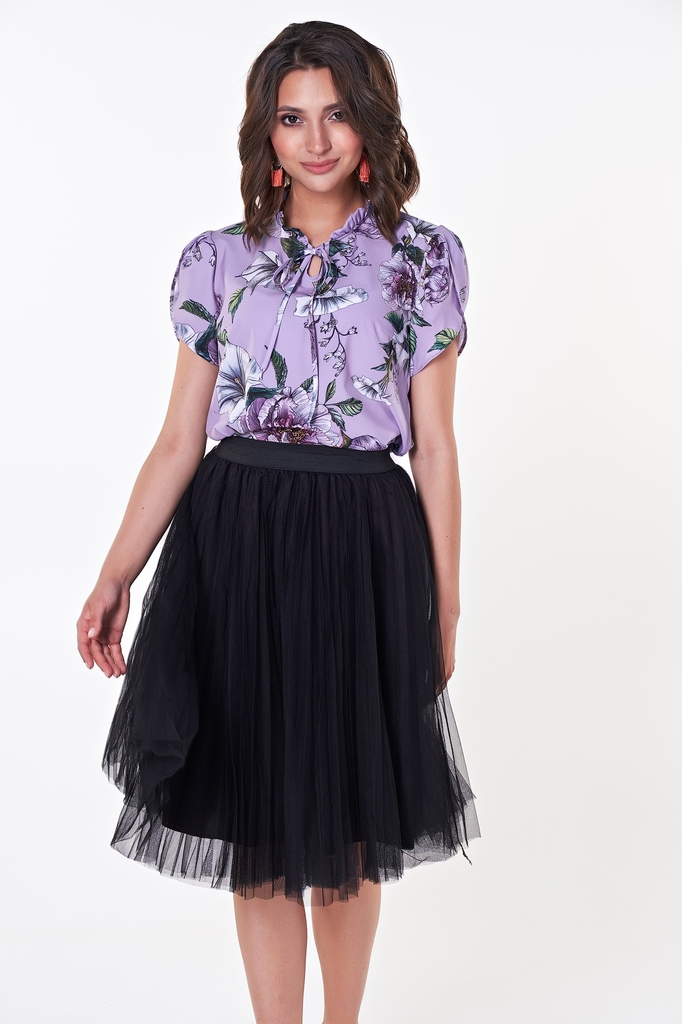 Очаровательная блузка в романтичном стиле прямого силуэта, дополнена оборками по переду и горловине. Застежка на пуговицах. Короткий втачной рукав обработан по низу резинкой и оканчивается сборкой. Бл... Показать описаниеузка представлена с юбкой Паула №1 Длина изделия: 63 см. Длина рукава: 31 см. Рост фотомодели: 172 см. Размер фотомодели: 44 Ткань: шифон.