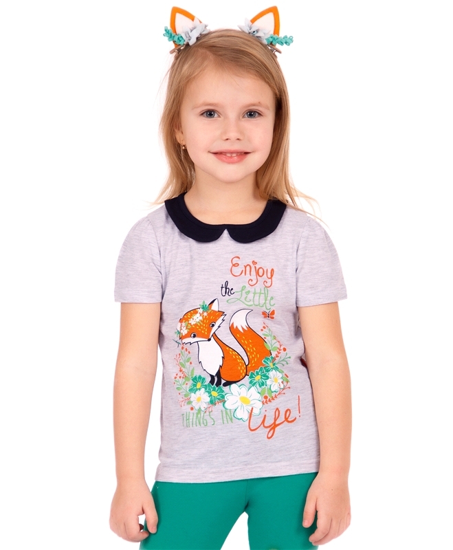 Состав: кулир / хлопок 70% + ПЭ 30%. Футболка для девочки выполнена из тонкого хлопкового полотна. Изделие с короткими рукавами, декорировано воротничком и ярким принтом. Уход: только машинная стирка ... Показать описание(руками не стирать!) при температуре 40 градусов, без предварительного замачивания. Изделия с печатью и декором перед стиркой необходимо вывернуть на изнаночную сторону.
