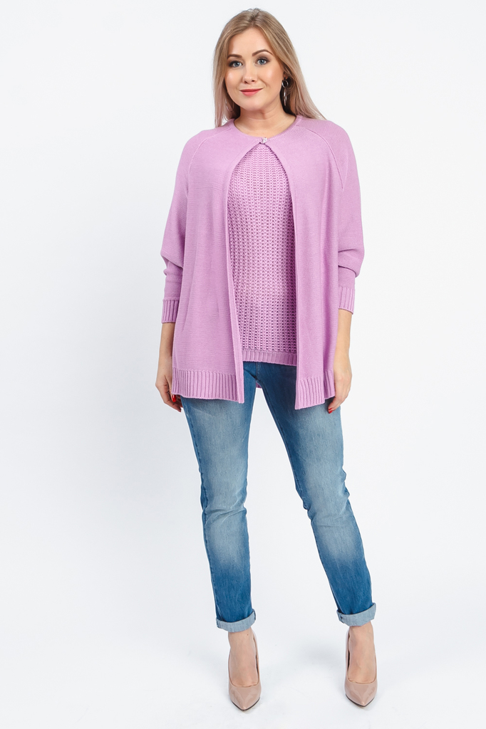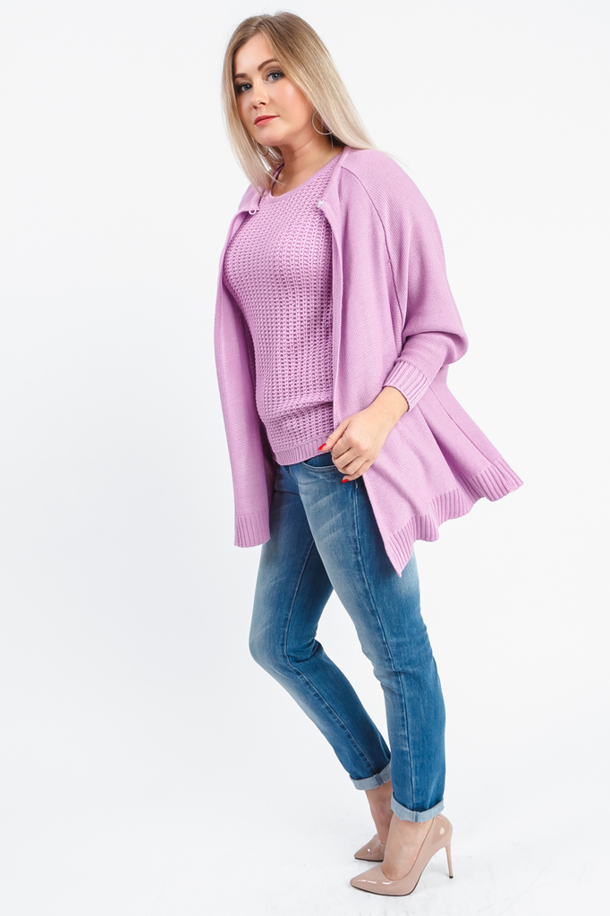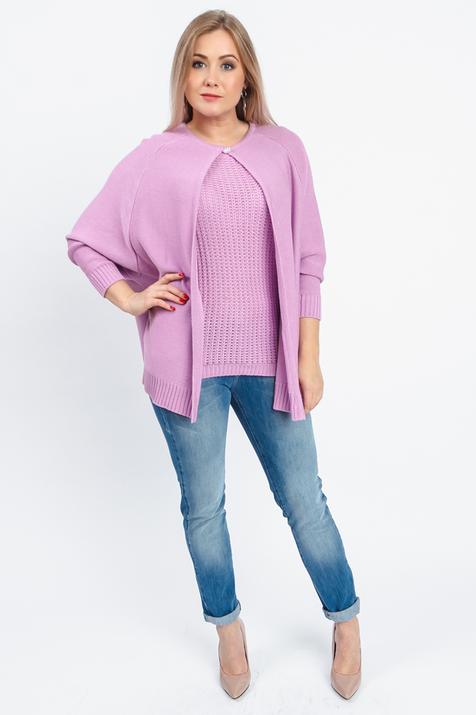 Стильный костюм нежного оттенка. Модель выполнена из пряжи. Вязаные изделия - это красота, тепло и комфорт. В вязаных вещах очень легко оставаться женственной. Комплект состоит из кардигана и майки. К... Показать описаниеардиган силуэта "трапеция" с застежкой на одну пуговицу. Низ асимметричный. На спинке средний шов. Борта и горловина обработаны бейками. Рукав реглан, 7/8, с углубленной проймой. Майка приталенного силуэта, горловина и проймы обработаны бейками. В изделии использованы цвета: сиреневый. Длина рукава (от конечной плечевой точки) - 51 ± 1 см. Длина кардигана: 46 размер - 70 ± 2 см. 48 размер - 70 ± 2 см. 50 размер - 70 ± 2 см. 52 размер - 70 ± 2 см. 54 размер - 73 ± 2 см. 56 размер - 73 ± 2 см. 58 размер - 73 ± 2 см. Длина майки: 46 размер - 60 ± 2 см. 48 размер - 60 ± 2 см. 50 размер - 60 ± 2 см. 52 размер - 60 ± 2 см. 54 размер - 62 ± 2 см. 56 размер - 62 ± 2 см. 58 размер - 62 ± 2 см. Параметры девушки-фотомодели: Рост - 168 см. Размер - 48 Обхват груди - 97 ± 1 см. Обхват талии - 77 ± 1 см. Обхват бёдер - 104 ± 1 см. Длина переда до талии - 48 ± 1 см. Длина спины до талии - 40 ± 1 см. Длина руки - 60 ± 1 см.