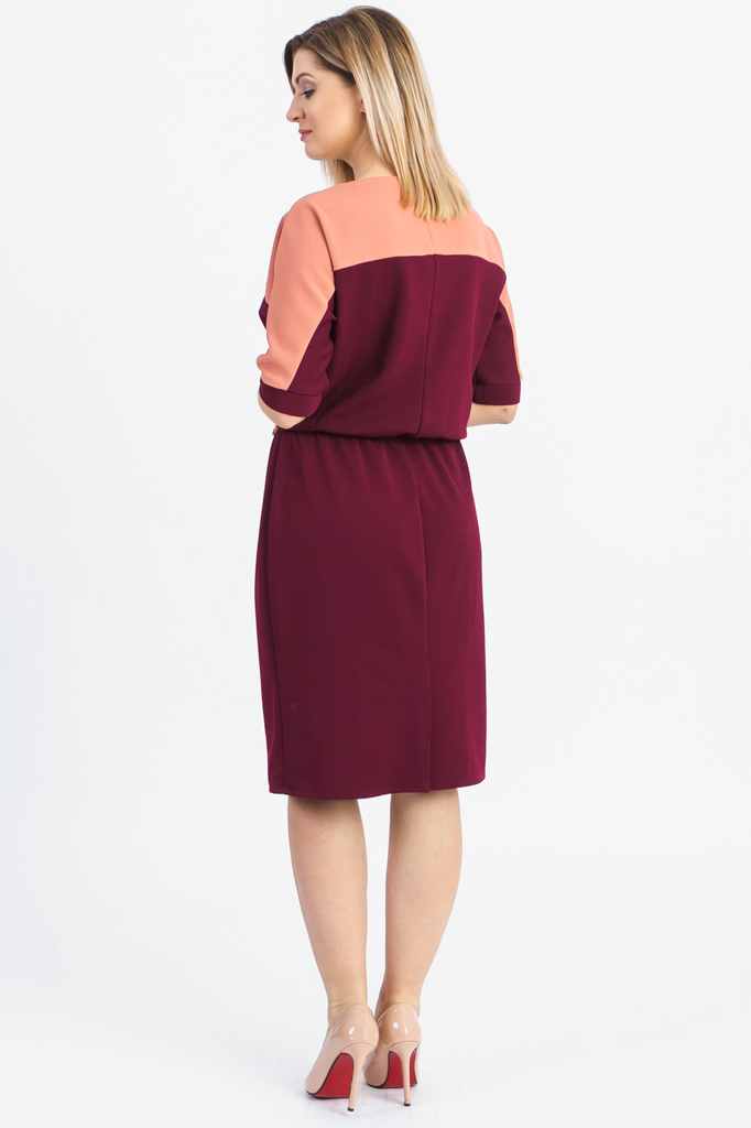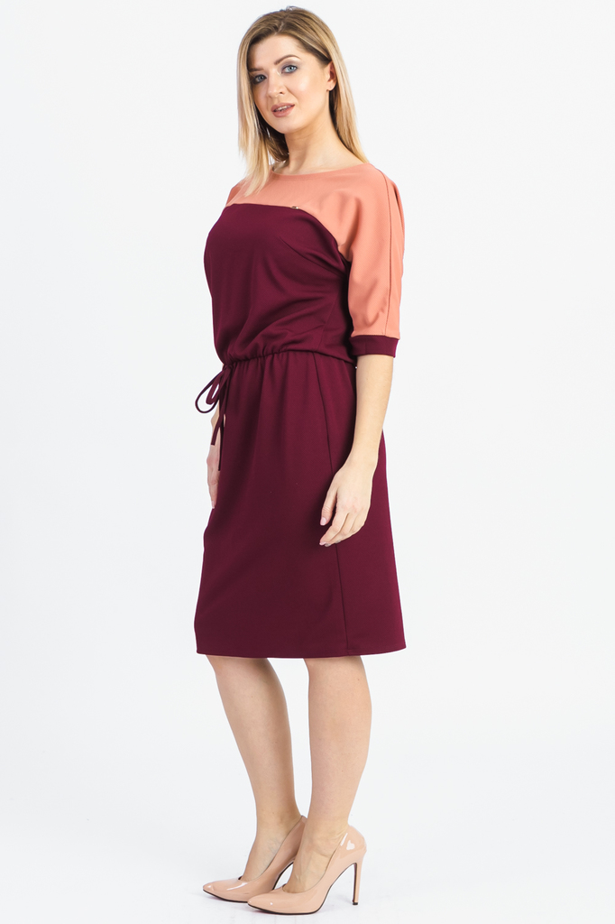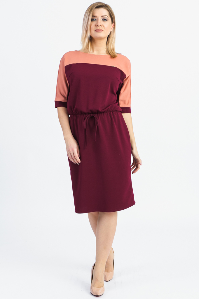 Платье - символ изысканности и элегантности, создайте свой утонченный образ с помощью этого стильного платья. Платье полуприлегающего силуэта, отрезное по линии талии с резинкой и напуском. Кокетки на... Показать описание передней и задней частях изделия. На передней части изделия по талии декоративный шнурок. На спинке средний шов и шлица. Рукав цельнокроенный, до локтя, с притачной манжетой по низу. В изделии использованы цвета: бордовый, коралловый. Длина рукава (от конечной плечевой точки) - 35 ± 1 см. Длина изделия - 105 ± 2 см. Параметры девушки-фотомодели: Рост - 167 см. Размер - 44-46 Обхват груди - 89 см. ± 1 см. Обхват талии - 69 см. ± 1 см. Обхват бёдер - 99 см. ± 1 см. Длина переда до талии - 45 см. ± 1 см. Длина спины до талии - 40 см. ± 1 см. Длина руки - 60 см. ± 1 см.