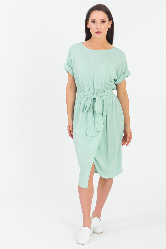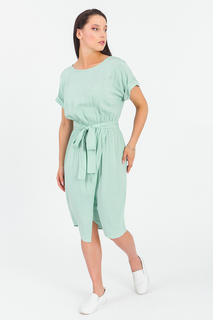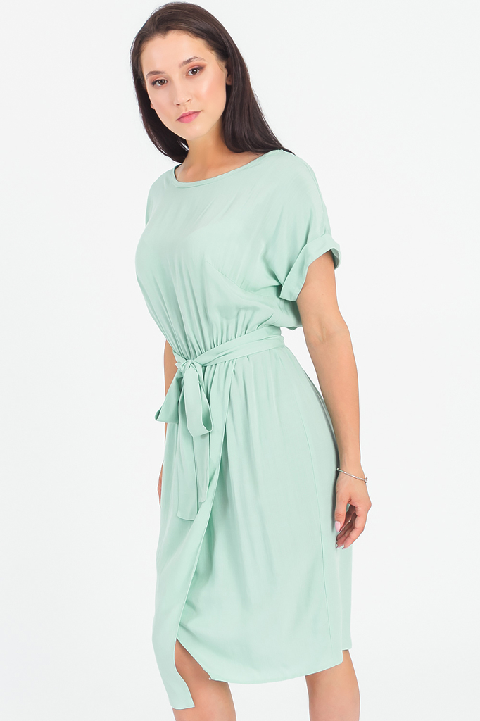 Лаконичное однотонное платье станет актуальным вариантом на каждый день. Стильное платье разнообразит Ваш гардероб. Платье полуприлегающего силуэта, отрезное по линии талии с резинкой и съемным поясом... Показать описание. Юбка на "запах" с чуть асимметричным низом. На спинке юбки средний шов. Горловина "лодочка" окантована. Рукав цельнокроенный, короткий с манжетой на отворот. В изделии использованы цвета: бирюзовый. Длина рукава (от конечной плечевой точки) - 18 ± 1 см. Длина изделия - 105 ± 2 см. Параметры девушки-фотомодели: Рост - 169 см. Размер - 46 Обхват груди - 92 см. ± 1 см. Обхват талии - 70 см. ± 1 см. Обхват бёдер - 102 см. ± 1 см.