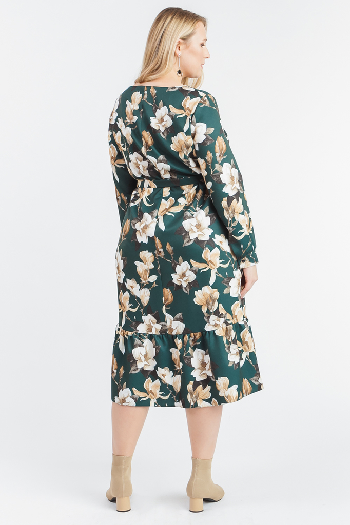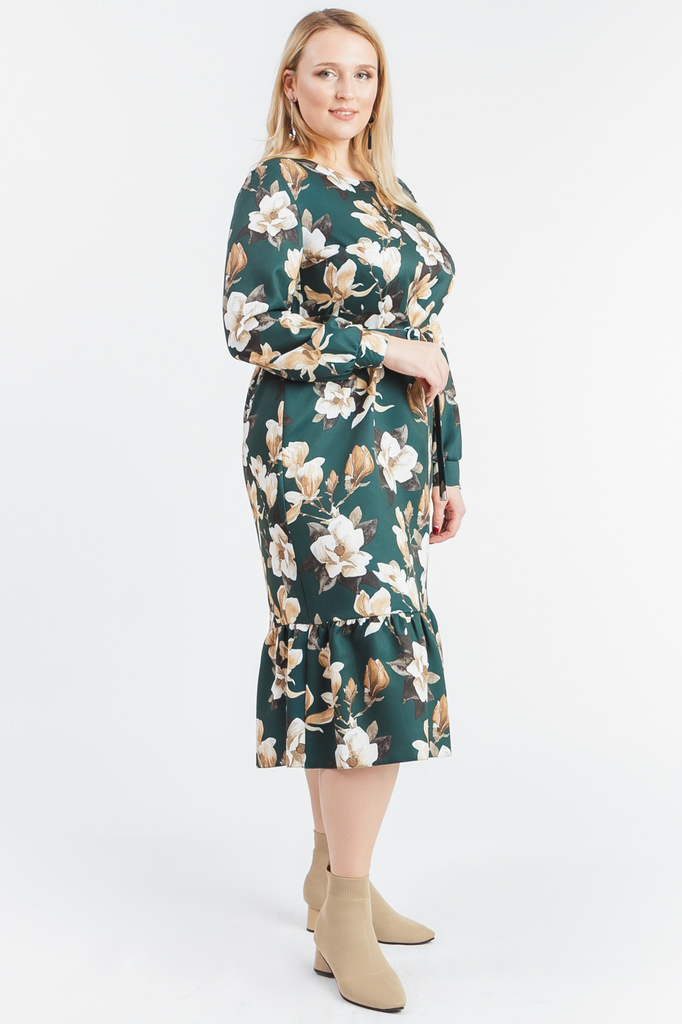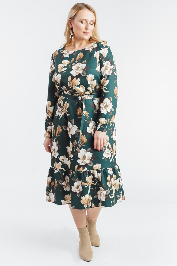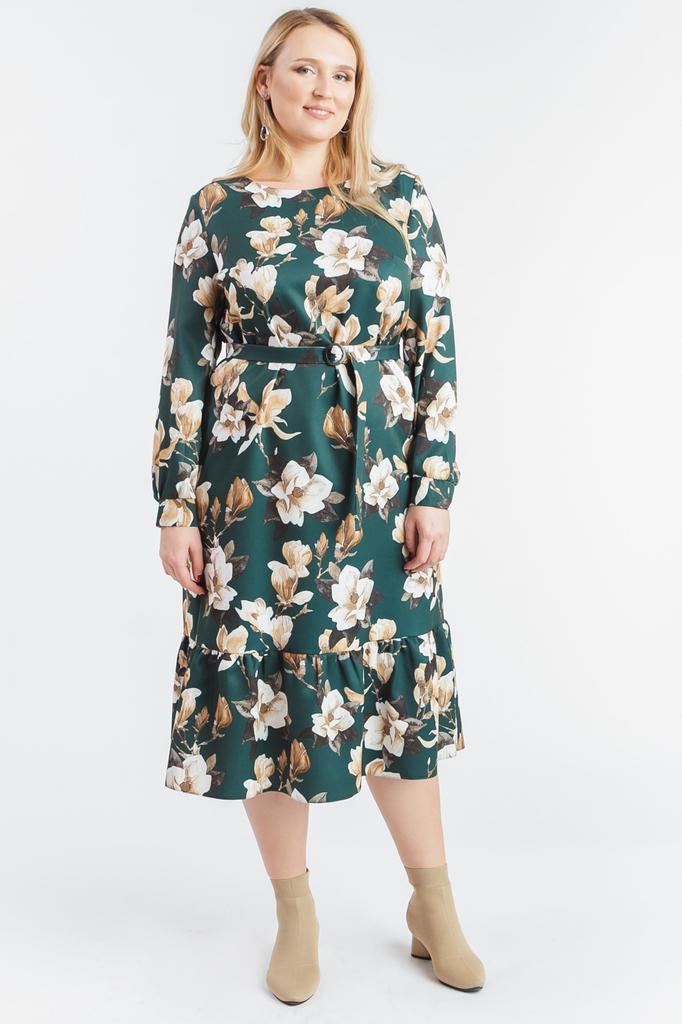 Это очаровательное платье придаст гардеробу новое дыхание! Благодаря лаконичному фасону, эта модель легко подойдет к другим предметам гардероба и позволит создавать стильные образы. Платье полуприлега... Показать описаниеющего силуэта со съемным поясом с пряжкой. По низу широкий волан. На спинке средний шов. Горловина обработана обтачкой. Рукав втачной, длинный, по низу манжета с застежкой на пуговицу. В изделии использованы цвета: зеленый и др. Длина рукава - 60 ± 1 см. Длина изделия - 116 ± 2 см. Параметры девушки-фотомодели: Рост - 170 см. Размер - 52 Обхват груди - 102 ± 1 см. Обхват талии - 82 ± 1 см. Обхват бёдер - 118 ± 1 см.