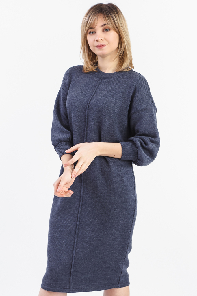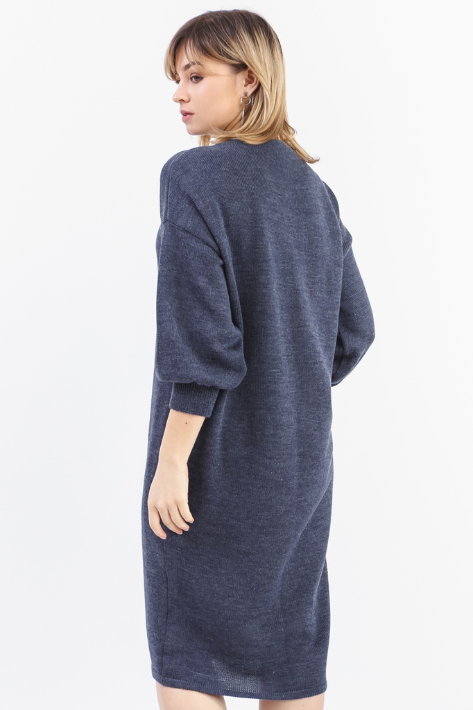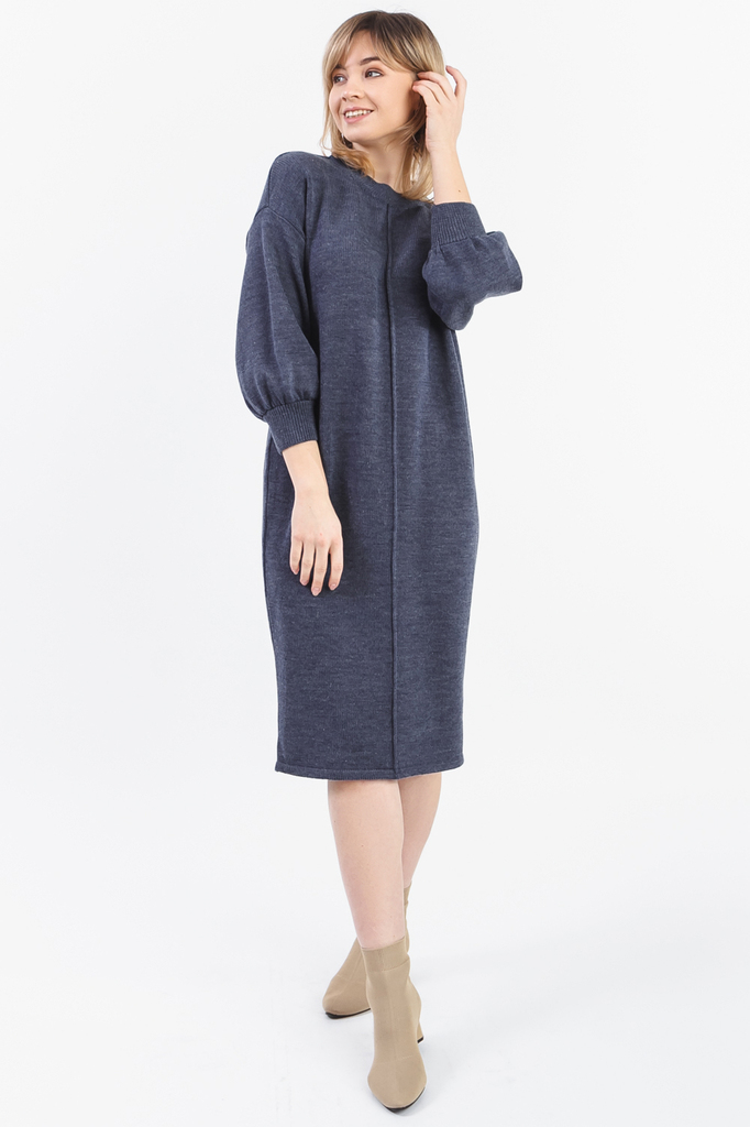 Однотонное женское платье. Модель выполнена из пряжи. Вязаная одежда всегда актуальна, отличается комфортом и практичностью. Изделия из пряжи займут достойное место в гардеробе и станут прекрасной осн... Показать описаниеовой для стильных образов. Платье свободного прямого силуэта. Горловина округлая, обработана бейкой. Рукав 3/4 со спущенной линией плеча, с манжетой. В изделии использованы цвета: синий. Длина рукава (от конечной плечевой точки) - 45 ± 1 см. Длина изделия - 100 ± 2 см. Параметры девушки-фотомодели: Рост - 166 см. Размер - 46-48 Обхват груди - 97,5 ± 1 см. Обхват талии - 79 ± 1 см. Обхват бёдер - 110 ± 1 см. Длина переда до талии - 43,5 ± 1 см. Длина спины до талии - 42 ± 1 см. Длина руки - 59 ± 1 см.