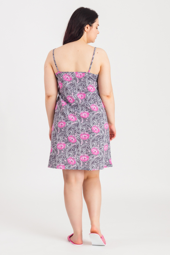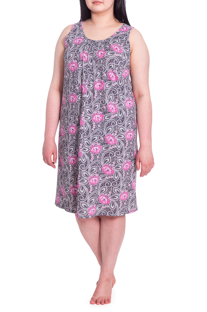 Домашняя одежда должна радовать Вас и Ваших родных, создавая в доме теплую, уютную атмосферу. Ассортимент нашей домашней одежды позволит Вам выглядеть красиво, чувствуя себя при этом комфортно и удобн... Показать описаниео. Ночная сорочка полуприлегающего силуэта с защипами на передней части изделия. Горловина и проймы окантованы. В изделии использованы цвета: серый, розовый. Рост девушки-фотомодели 164 см. Длина изделия - 98 ± 2 см.