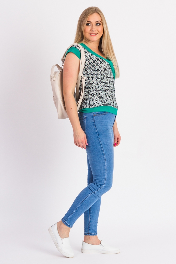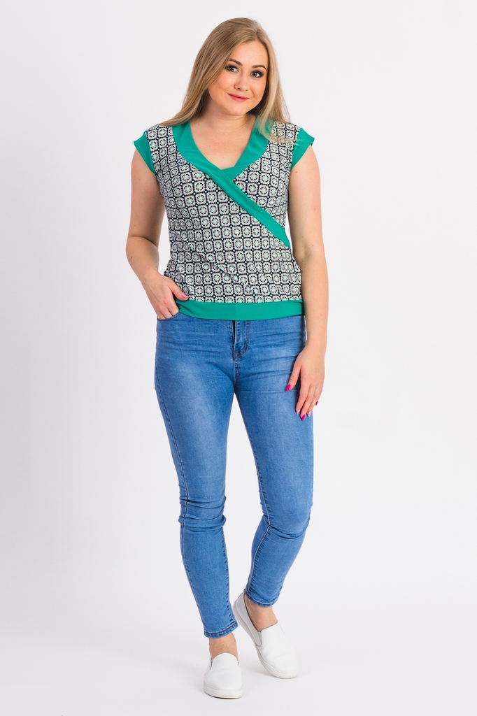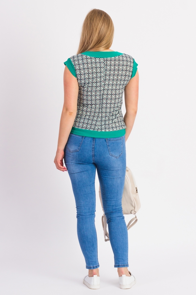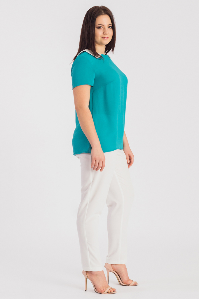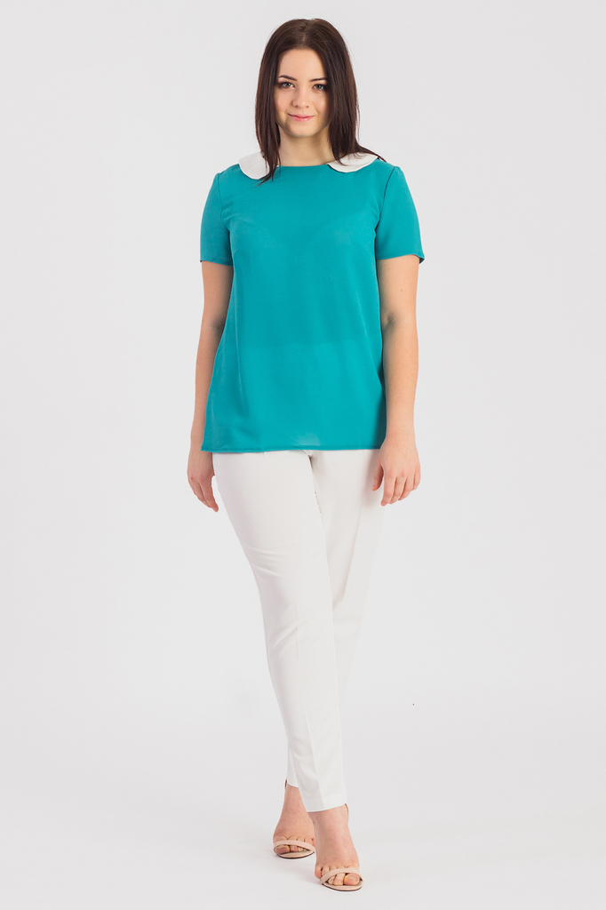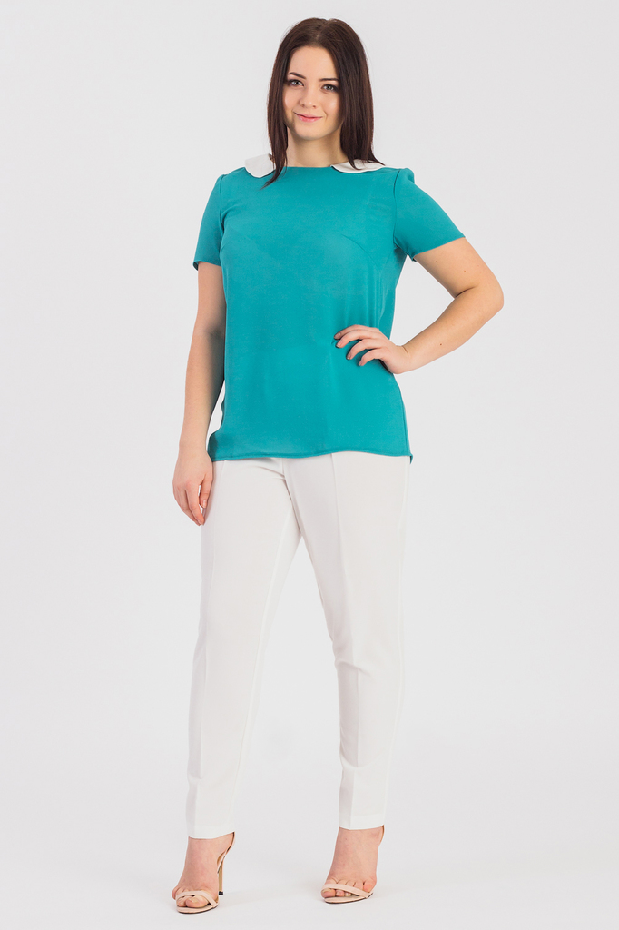 Классическая женская блузка из приятного к телу трикотажа станет основой Вашего повседневного гардероба. Женская блузка полуприлегающего силуэта с нагрудными вытачками. На спинке средний шов. Отложной... Показать описание воротник. Рукав втачной, короткий. Цвет: бирюзовый с белым. Длина рукава - 21 ± 1 см. Длина изделия - 65 ± 2 см. Параметры девушки-фотомодели: Рост - 166 см. Размер - 50 Обхват груди - 97,5 ± 1 см. Обхват талии - 79 ± 1 см. Обхват бёдер - 110 ± 1 см. Длина переда до талии - 43,5 ± 1 см. Длина спины до талии - 42 ± 1 см. Длина руки - 59 ± 1 см.
