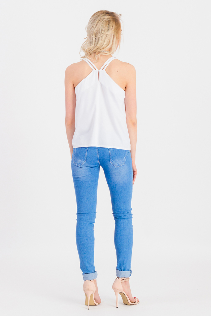 Оригинальный топ способен сделать Ваш образ более изысканным. Добавьте себе шика! Топ на двойных бретельках. Передняя часть изделия задрапирована. На спинке средний шов с капелькой и застежкой на пуго... Показать описаниевицу. Проймы обработаны обтачками. Цвет: белый. Длина изделия (от 7го шейного позвонка) - 57 ± 2 см. Параметры девушки-фотомодели: Рост - 168 см. Размер - 40 Обхват груди - 80 ± 1 см. Обхват талии - 58 ± 1 см. Обхват бёдер - 84 ± 1 см.