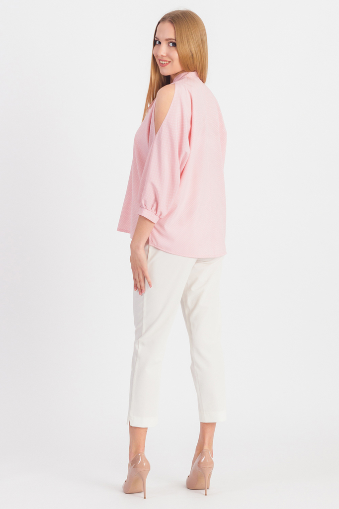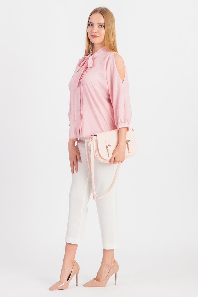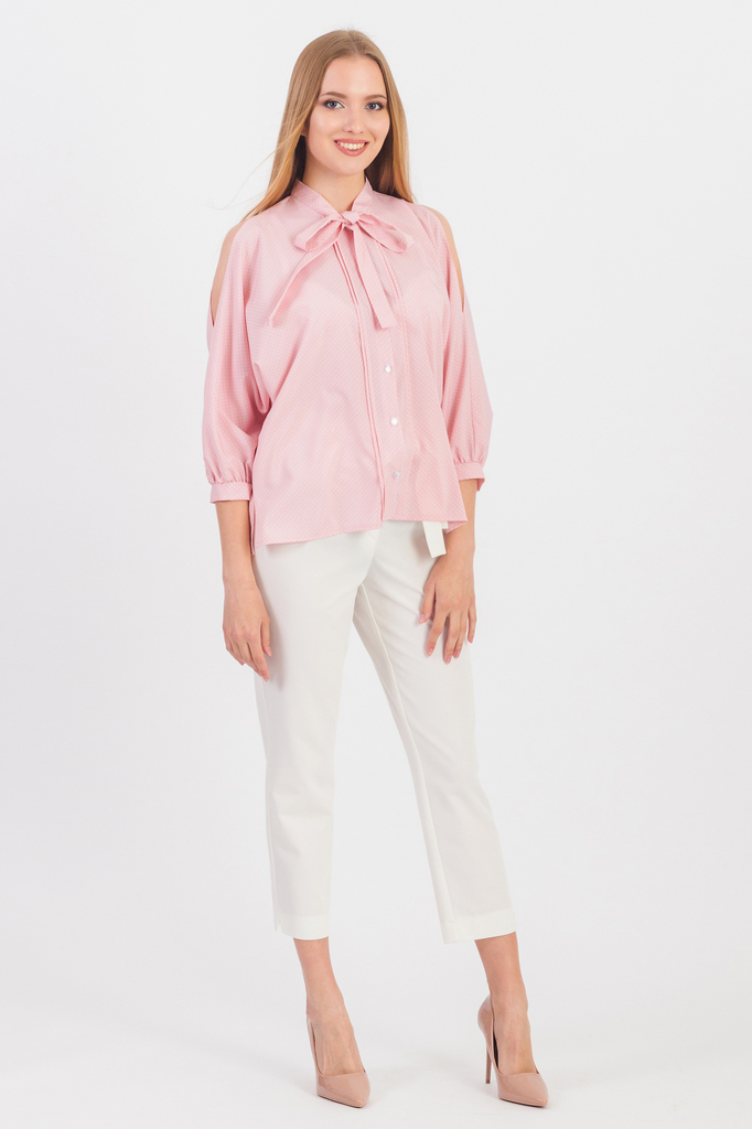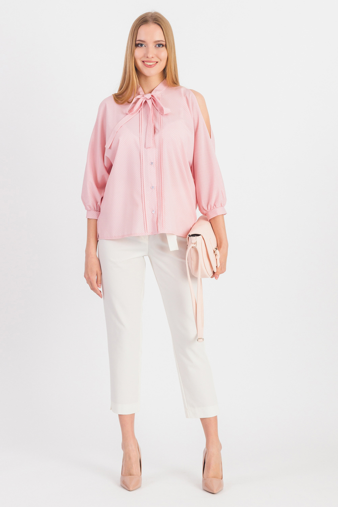Блузка - незаменимый вариант для женского гардероба. Оригинальная блузка подчеркнет Вашу индивидуальность и привлечет интерес и внимание окружающих. Блузка свободного кроя с фигурным низом и разрезами... Показать описание по бокам. На передней части изделия застежка на пуговицы и защипы. На спинке средний шов. Воротник стойка, завязывающийся в бант. Рукав цельнокроенный, 7/8, с вырезом на плече, сборкой и манжетой по низу. В изделии использованы цвета: розовый и др. Длина изделия - 64 ± 2 см. Длина рукава - 47 ± 1 см. (от конечной плечевой точки) При создании образа, который Вы видите на фотографии, были использованы брюки арт. B1318, а также сумка арт. SMK11816. Для просмотра модели введите артикул в строке поиска. Параметры девушки-фотомодели: Рост - 170 см. Размер - 42 Обхват груди - 84 ± 1 см. Обхват талии - 66 ± 1 см. Обхват бёдер - 90 ± 1 см. Длина переда до талии - 43 ± 1 см. Длина спины до талии - 45 ± 1 см. Длина руки - 60 ± 1 см.