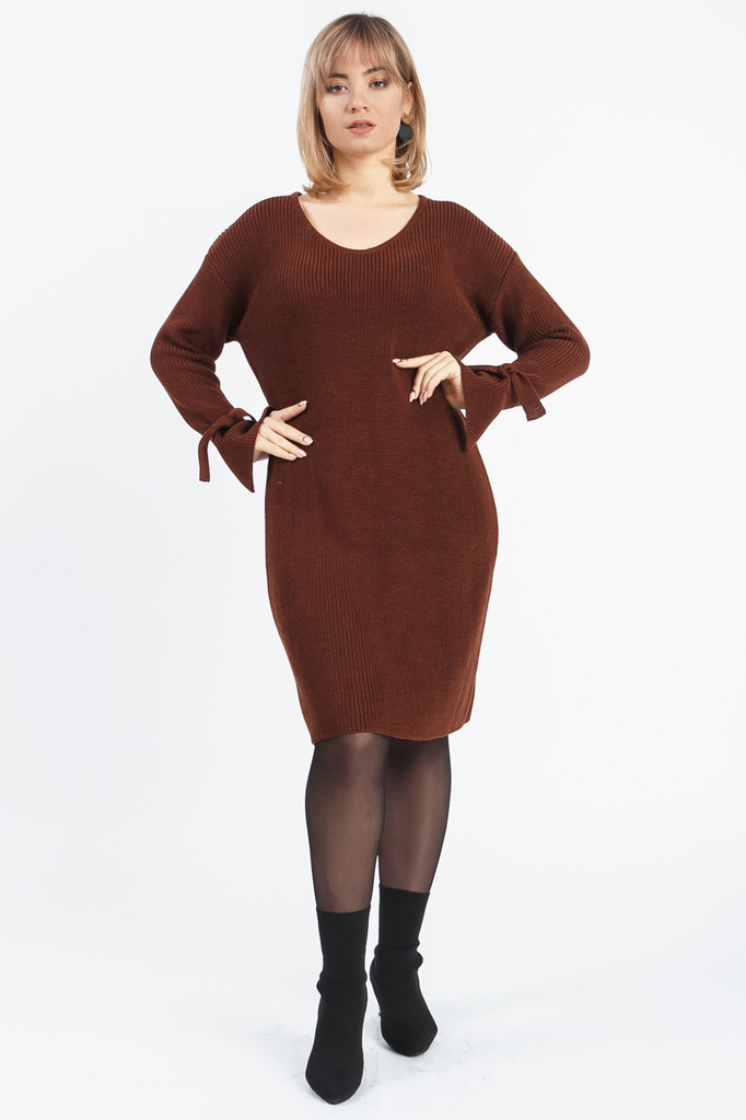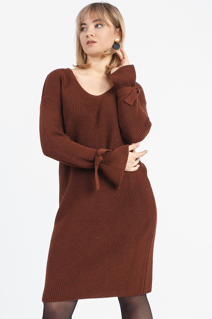 Однотонное женственное платье. Модель выполнена из пряжи. Вязаные изделия - это красота, тепло и комфорт. В вязаных вещах очень легко оставаться женственной и в то же время не замёрзнуть. Платье прямо... Показать описаниего силуэта. Горловина обработана бейкой. Рукав рубашечный, длинный, со спущенной линией плеча. По низу рукава разрез и завязки. В изделии использованы цвета: коричневый. Длина рукава (от конечной плечевой точки) - 62 ± 1 см. Длина изделия: 46 размер - 91 ± 2 см. 48 размер - 91 ± 2 см. 50 размер - 91 ± 2 см. 52 размер - 91 ± 2 см. 54 размер - 94 ± 2 см. 56 размер - 94 ± 2 см. 58 размер - 94 ± 2 см. Параметры девушки-фотомодели: Рост - 166 см. Размер - 50 Обхват груди - 97,5 ± 1 см. Обхват талии - 79 ± 1 см. Обхват бёдер - 110 ± 1 см. Длина переда до талии - 43,5 ± 1 см. Длина спины до талии - 42 ± 1 см. Длина руки - 59 ± 1 см.