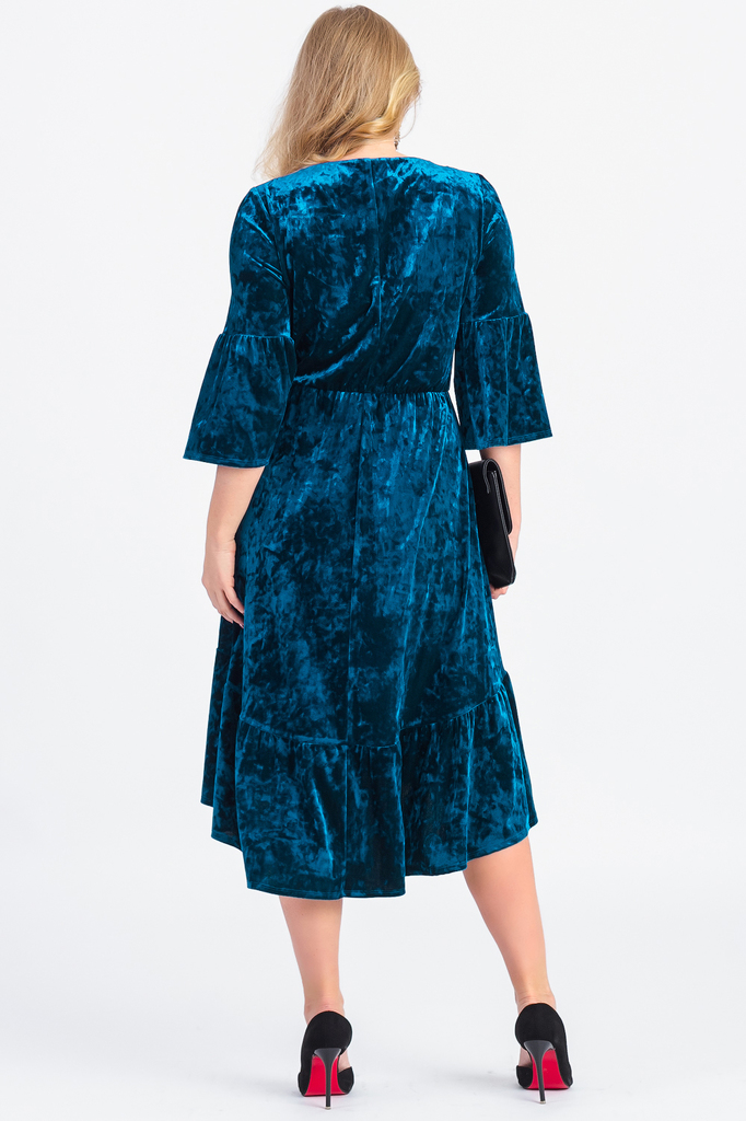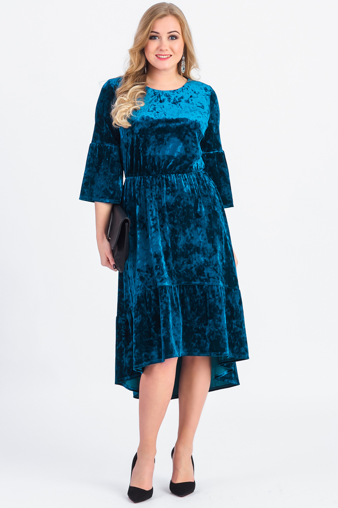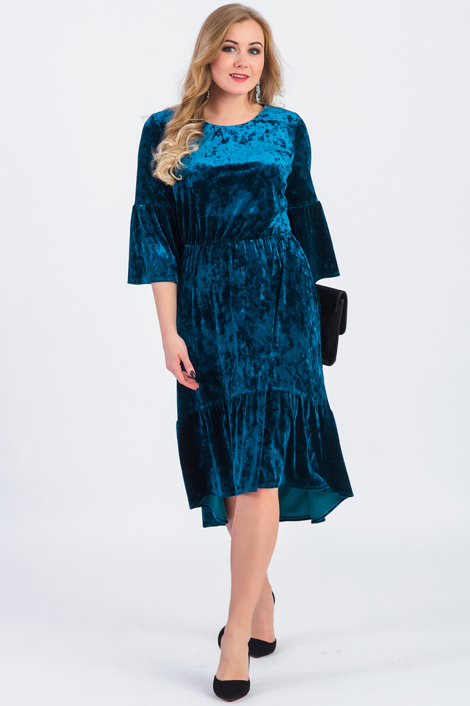 Бархатное платье с фигурным низом превратит Вас в настоящую королеву любого праздничного мероприятия! В нем Вы будете выглядеть эффектно и благородно. Платье приталенного силуэта, отрезное по линии та... Показать описаниелии с резинкой. Низ изделия фигурный с широким воланом. На спинке средний шов. Горловина обработана обтачкой. Рукав втачной, 3/4, с широким воланом по низу. Просьба учесть, ткань может краситься. Перед использованием рекомендуем постирать платье в слабом растворе уксуса или поваренной соли для закрепления красителя ткани. В изделии использованы цвета: темно-бирюзовый. Длина рукава - 44 ± 1 см. Длина изделия - 119 ± 2 см. При создании образа, который Вы видите на фотографии, также была использована сумка арт.SMK3817. Для просмотра модели введите артикул в строке поиска. Параметры девушки-фотомодели: Рост - 168 см. Размер - 48 Обхват груди - 97 ± 1 см. Обхват талии - 77 ± 1 см. Обхват бёдер - 104 ± 1 см. Длина переда до талии - 48 ± 1 см. Длина спины до талии - 40 ± 1 см. Длина руки - 60 ± 1 см.