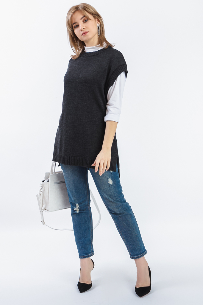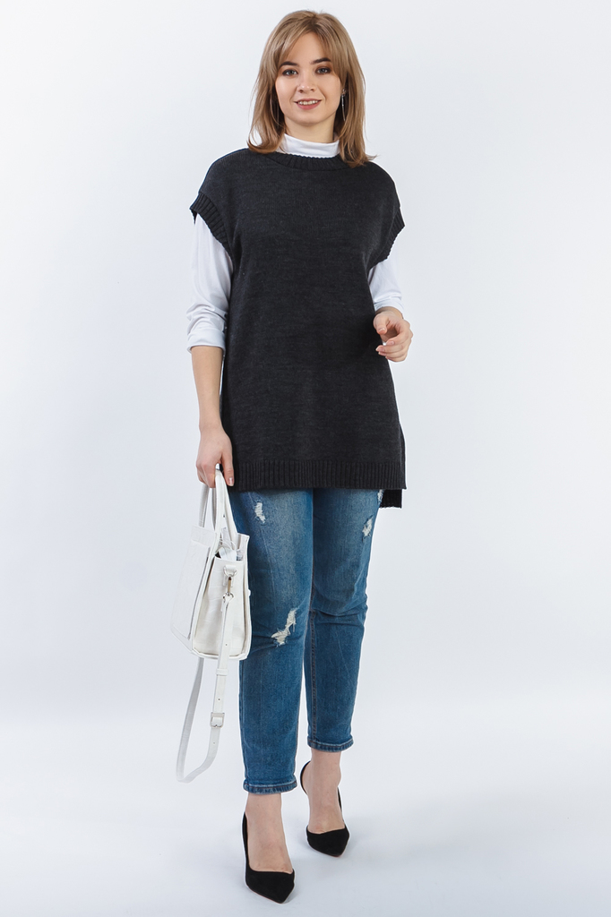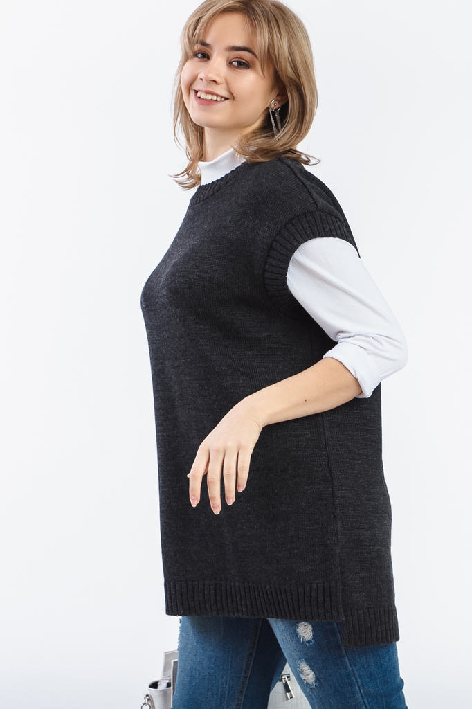 Женский удлиненный жилет без застежек. Этот жилет хорошо вписывается и в деловые будни, и в повседневный стиль. Жилет с ассиметричным низом прямого силуэта. Горловина и проймы обработаны бейкой-резинк... Показать описаниеой. В боковых швах-разрезы. В изделии использованы цвета: темно-серый. Длина изделия - 76 ± 2 см. При создании образа, который Вы видите на фотографии, также была использована сумка арт.SMK4919. Для просмотра модели введите артикул в строке поиска. Параметры девушки-фотомодели: Рост - 166 см. Размер - 46-48 Обхват груди - 93 ± 1 см. Обхват талии - 69 ± 1 см. Обхват бёдер - 101 ± 1 см. Длина переда до талии - 44 ± 1 см. Длина спины до талии - 42 ± 1 см. Длина руки - 59 ± 1 см.