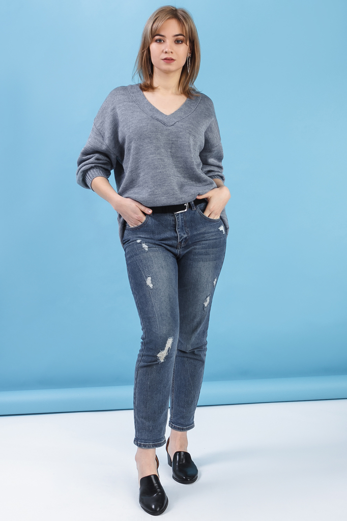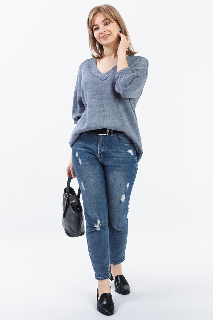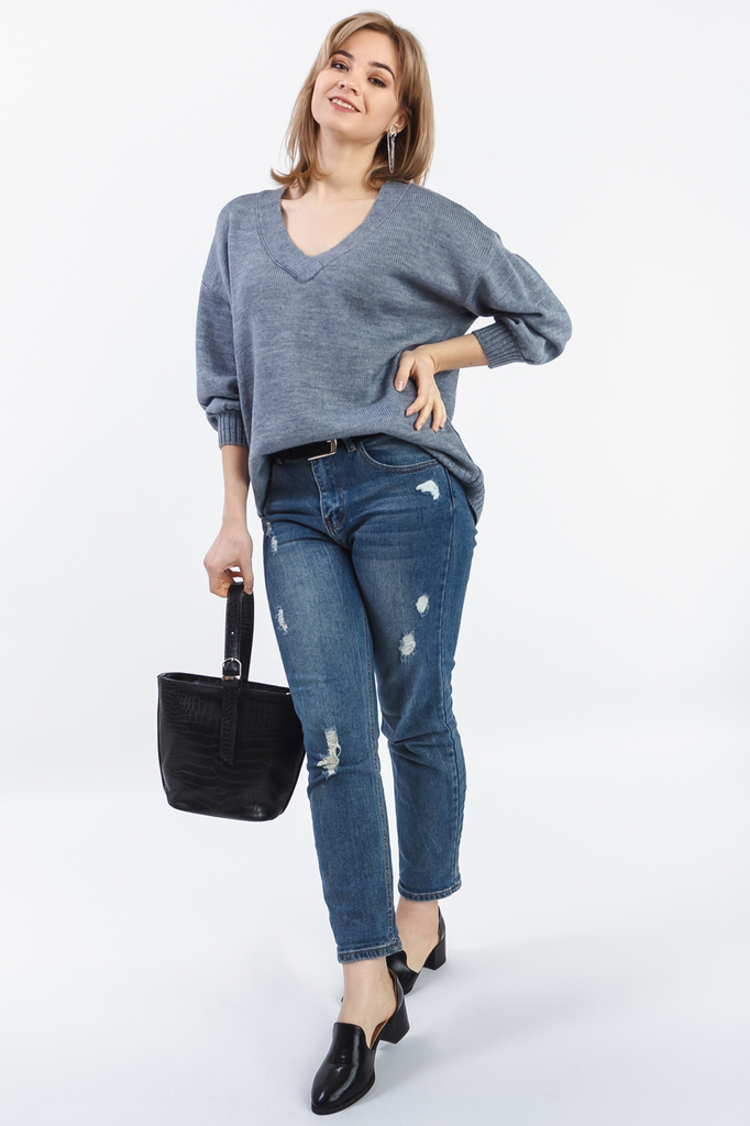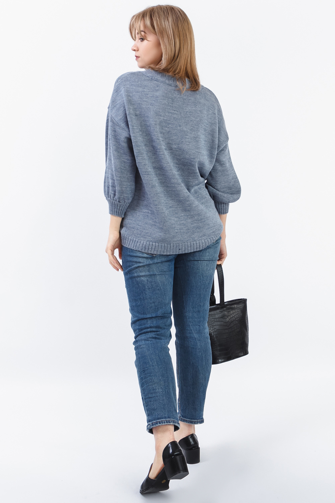 Джемпер "оверсайз". Модель выполнена из пряжи. Вязаная одежда всегда актуальна, отличается комфортом и практичностью. Изделия из пряжи займут достойное место в гардеробе и станут прекрасной основой дл... Показать описаниея стильных образов. Джемпер прямого силуэта, "оверсайз". Горловина V-образная, обработана бейкой. Рукав рубашечный, 3/4, со спущенной линией плеча и манжетой на отворот. В изделии использованы цвета: серый. Длина рукава (от конечной плечевой точки) - 45 ± 1 см. Длина изделия - 64 ± 2 см. При создании образа, который Вы видите на фотографии, также была использована сумка арт.SMK11319. Для просмотра модели введите артикул в строке поиска. Параметры девушки-фотомодели: Рост - 166 см. Размер - 46-48 Обхват груди - 93 ± 1 см. Обхват талии - 69 ± 1 см. Обхват бёдер - 101 ± 1 см. Длина переда до талии - 44 ± 1 см. Длина спины до талии - 42 ± 1 см. Длина руки - 59 ± 1 см.