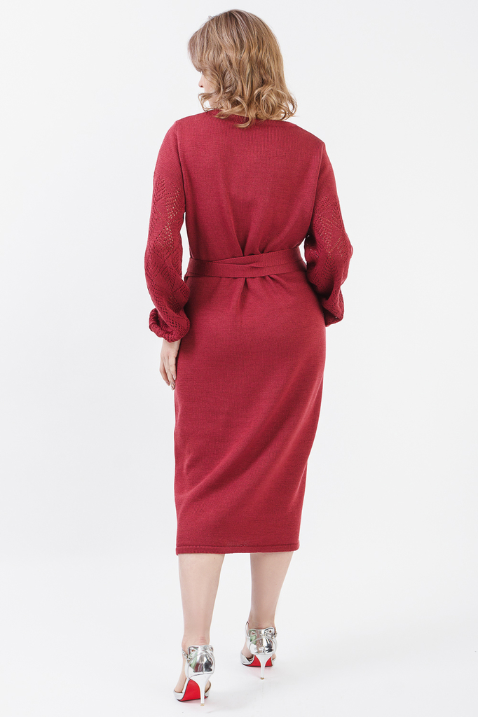 Очаровательное женское платье. Модель выполнена из пряжи. Вязаная одежда всегда актуальна, отличается комфортом и практичностью. Изделия из пряжи займут достойное место в Вашем гардеробе и станут прек... Показать описаниерасной основой для стильных образов. Платье полуприлегающего силуэта с поясом втаченным в боковые швы. На передней части изделия рез под грудью, лиф на "запах". Горловина обработана бейкой. Рукав втачной, длинный со сборкой на резинку по низу. Цвет: бордовый Длина рукава - 62 ± 1 см. Длина изделия - 111 ± 2 см. Параметры девушки-фотомодели: Рост - 170 см. Размер - 52 Обхват груди - 102 ± 1 см. Обхват талии - 82 ± 1 см. Обхват бёдер - 118 ± 1 см.
