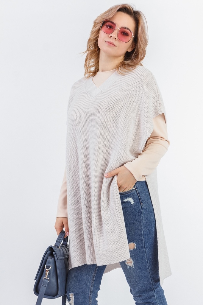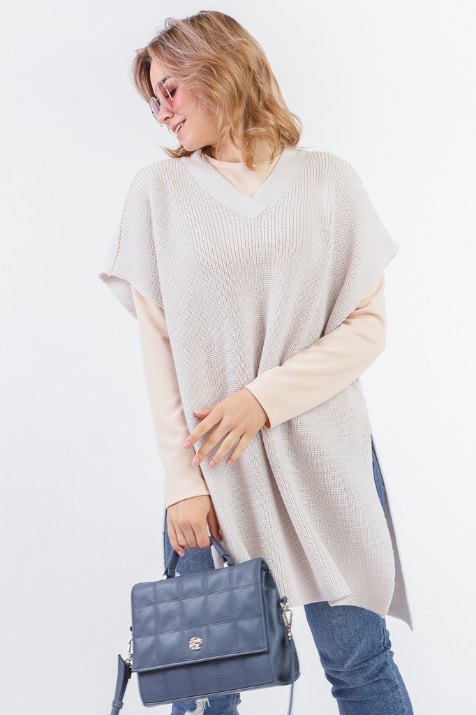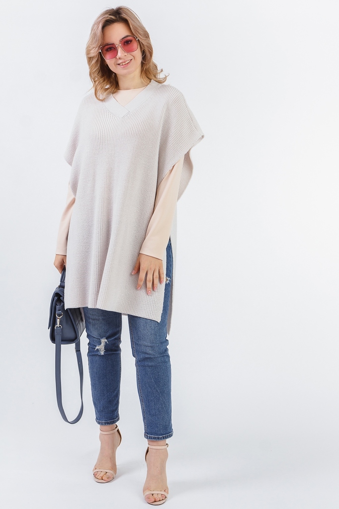 Ультрамодная накидка форме "пончо". Модель выполнена из пряжи. Вязаная одежда всегда актуальна, отличается комфортом и практичностью. Изделия из пряжи займут достойное место в Вашем гардеробе и станут... Показать описание прекрасной основой для стильных образов. Накидка прямого силуэта, без рукавов. Горловина V-образная, обработана широкой бейкой. Плечо спущенное. Низ изделия разноуровневый. Цвет: бежевый. Ширина плеч - 70 ± 1 см. Длина изделия - 86 ± 2 см. При создании образа, который Вы видите на фотографии, также была использована стильная сумка арт.SMK1771. Для просмотра модели введите артикул в строке поиска. Параметры девушки-фотомодели: Рост - 166 см. Размер - 46-48 Обхват груди - 93 ± 1 см. Обхват талии - 69 ± 1 см. Обхват бёдер - 101 ± 1 см. Длина переда до талии - 44 ± 1 см. Длина спины до талии - 42 ± 1 см. Длина руки - 59 ± 1 см.