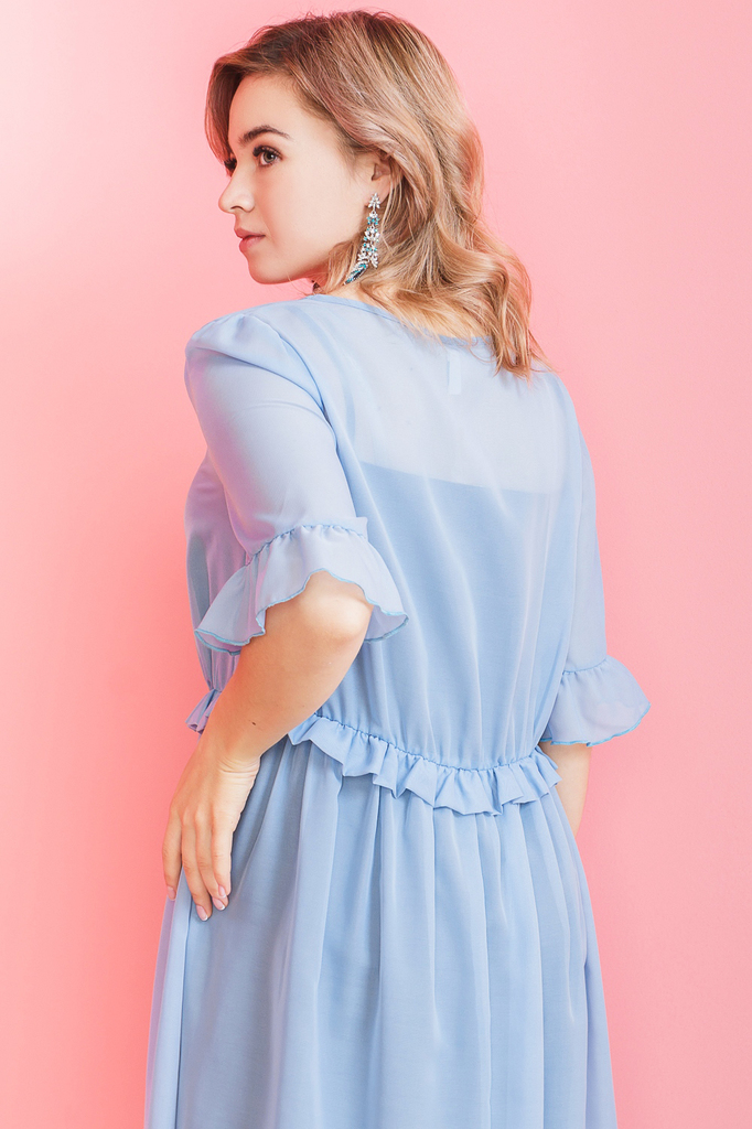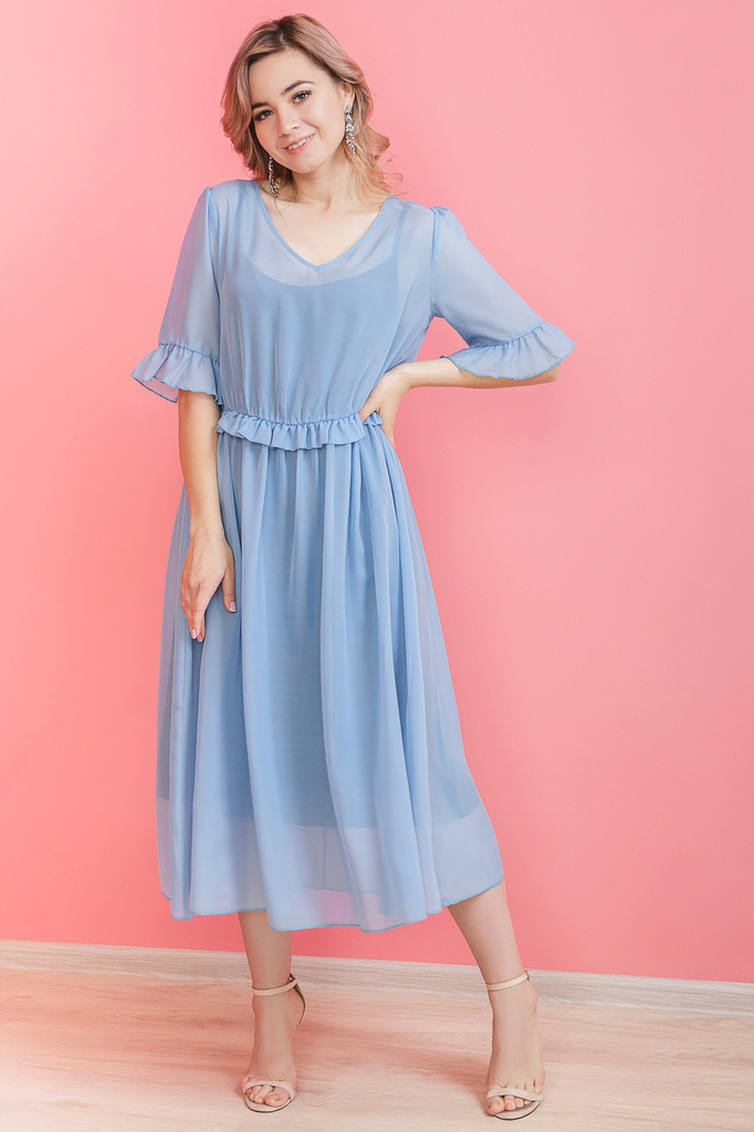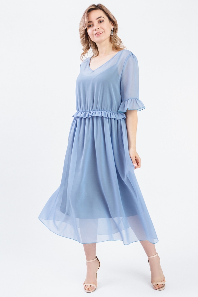 Легкое шифоновое платье - оптимальный вариант для лета. За счет воздушной ткани и свободного силуэта, платье подойдет любому типу фигуры. Платье силуэта "трапеция" на подкладе. Горловина V-образная, о... Показать описаниекантованная бейкой. Платье отрезное по завышенной линии талии. Спинка со средним швом. В талиевый шов втачан декоративные волан. Рукава короткие с притачной оборкой. Подклад - трикотажная майка на бретелях. Длина "миди". Цвет шифона - голубой, подклад - черный. Длина рукава (от конечной плечевой точки) - 32 ± 1 см. Длина изделия - 118 ± 2 см. Параметры девушки-фотомодели: Рост - 166 см. Размер - 46-48 Обхват груди - 93 ± 1 см. Обхват талии - 69 ± 1 см. Обхват бёдер - 101 ± 1 см. Длина переда до талии - 44 ± 1 см. Длина спины до талии - 42 ± 1 см. Длина руки - 59 ± 1 см.