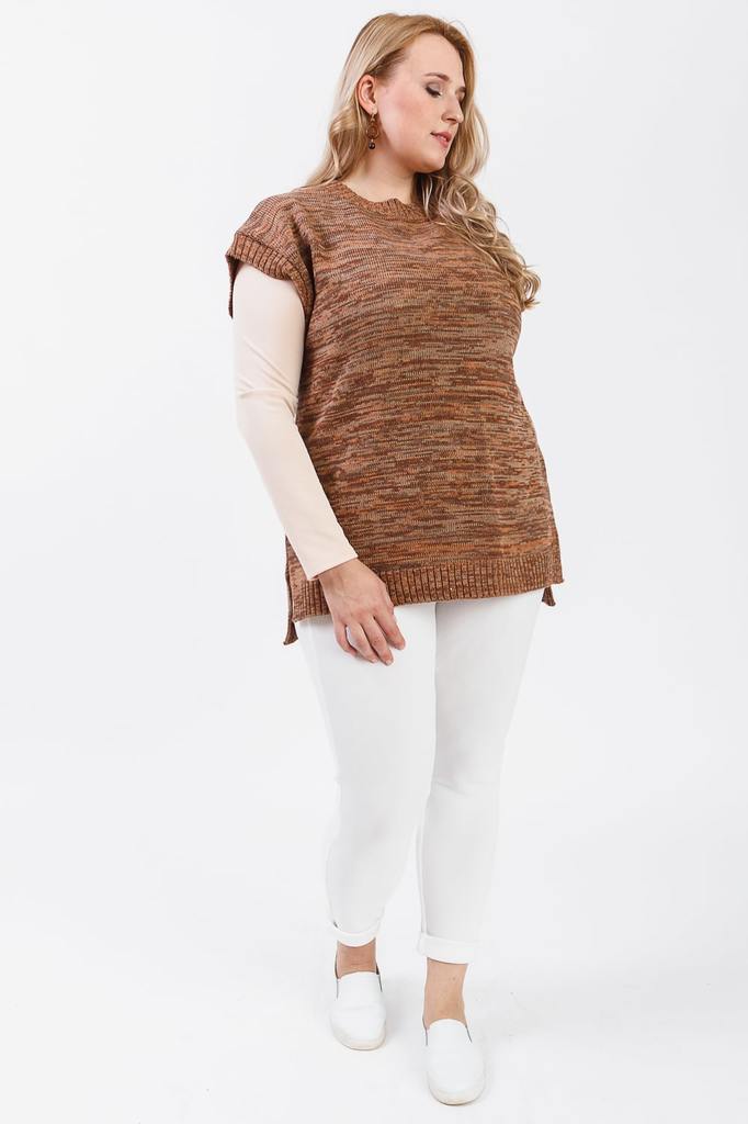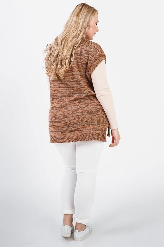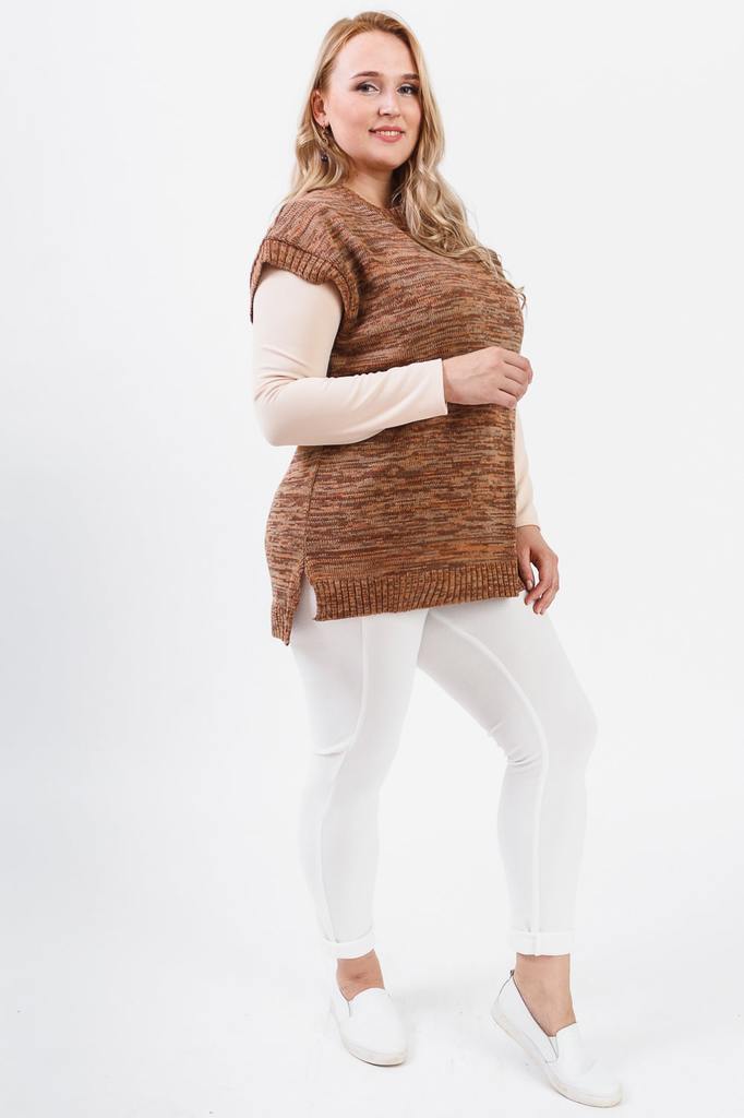 Женский удлиненный жилет без застежек. Изделие хорошо вписывается и в деловые будни, и в повседневный стиль. Жилет с ассиметричным низом прямого силуэта. Горловина и проймы обработаны бейкой-резинкой.... Показать описание В боковых швах разрезы. В изделии использованы цвета: персиковый, коричневый и др. Длина изделия - 76 ± 2 см. Параметры девушки-фотомодели: Рост - 170 см. Размер – 52-54 Обхват груди - 106 ± 1 см. Обхват талии - 86 ± 1 см. Обхват бёдер - 119 ± 1 см. Длина переда до талии – 52 ± 1 см. Длина спины до талии - 40 ± 1 см.