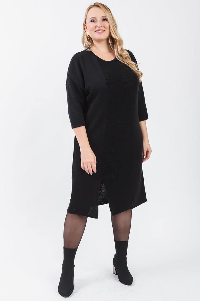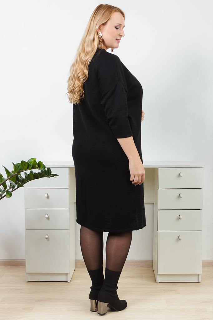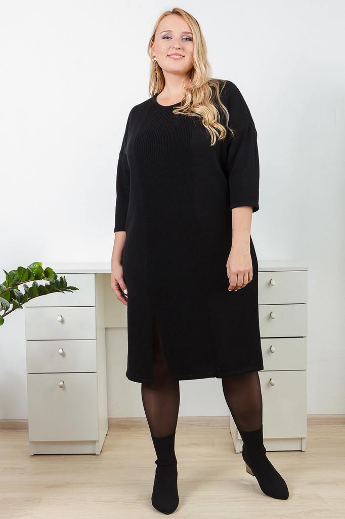 Универсальное женское платье с разрезом. Модель выполнена из пряжи. Вязаная одежда всегда актуальна, отличается комфортом и практичностью. Изделия из пряжи займут достойное место в Вашем гардеробе и с... Показать описаниетанут прекрасной основой для стильных образов. Платье силуэта "баллон" с разрезом на передней части изделия. Горловина обработана бейкой. Рукав рубашечный, 3/4, со спущенной линией плеча. В изделии использованы цвета: черный. Длина рукава (от конечной плечевой точки) - 42 ± 1 см. Длина изделия - 103 ± 2 см. Параметры девушки-фотомодели: Рост - 170 см. Размер - 52 Обхват груди - 102 ± 1 см. Обхват талии - 82 ± 1 см. Обхват бёдер - 118 ± 1 см.