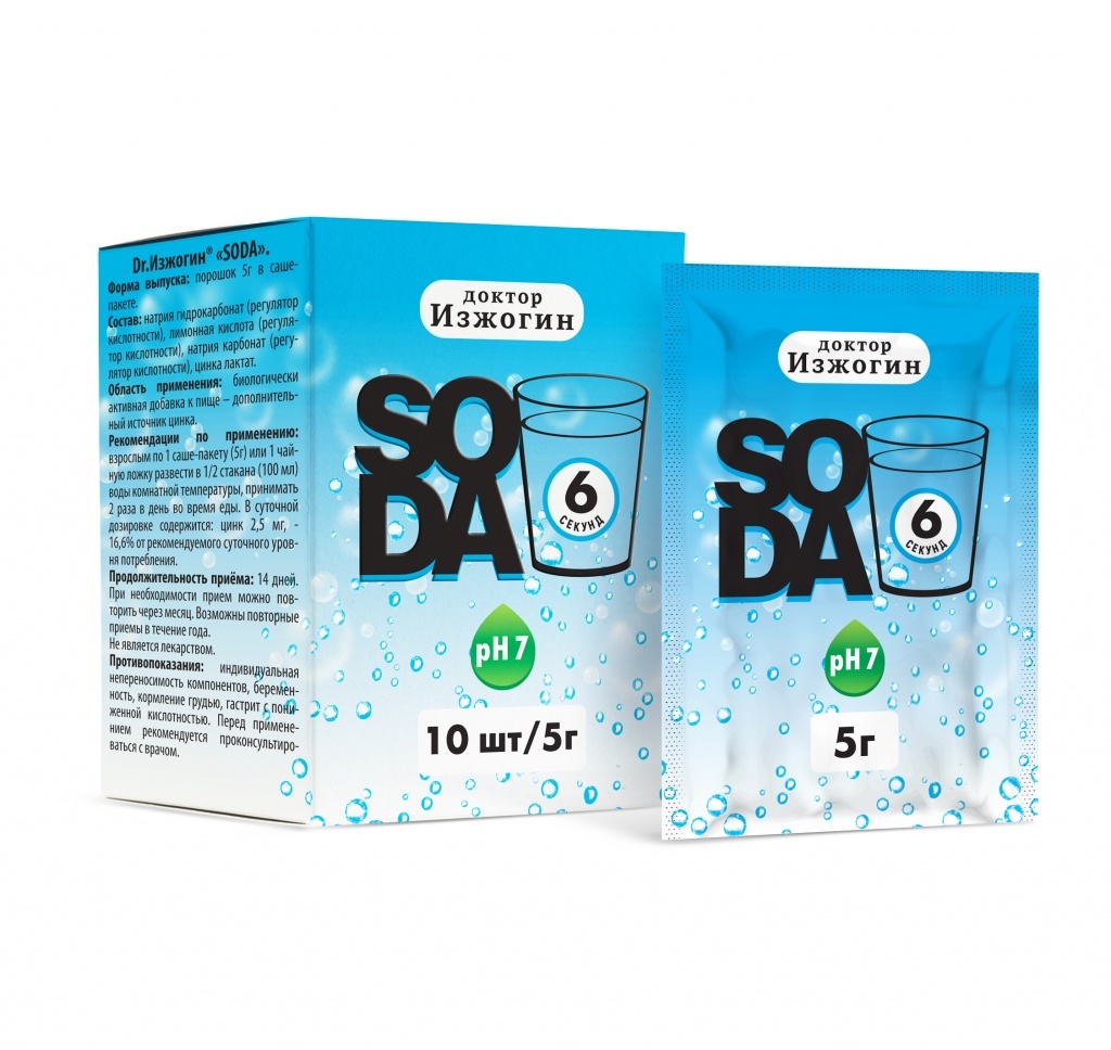 От изжоги. SODA в удобном саше-формате оказывает антацидное, абсорбирующее и обволакивающее действие, способствует снижают интенсивность выработки соляной кислоты, надежно избавляя от изжоги. Форма вы... Показать описаниепуска: саше 5г №10 Продолжительность приёма: 14 дней. При необходимости прием можно повторить через месяц. Возможны повторные приемы в течение года. Противопоказания: индивидуальная непереносимость компонентов, беременность, кормление грудью, гастрит с пониженной кислотностью. Перед применением рекомендуется проконсультироваться с врачом. СОСТАВ: натрия гидрокарбонат (регулятор кислотности), лимонная кислота (регулятор кислотности), натрия карбонат (регулятор кислотности), цинка лактат. СПОСОБ ПРИМЕНЕНИЯ: Взрослым по 1 саше-пакету (5 г) или 1 чайную ложку развести в 1/2 стакана (100 мл) воды комнатной температуры, принимать 2 раза в день во время еды.