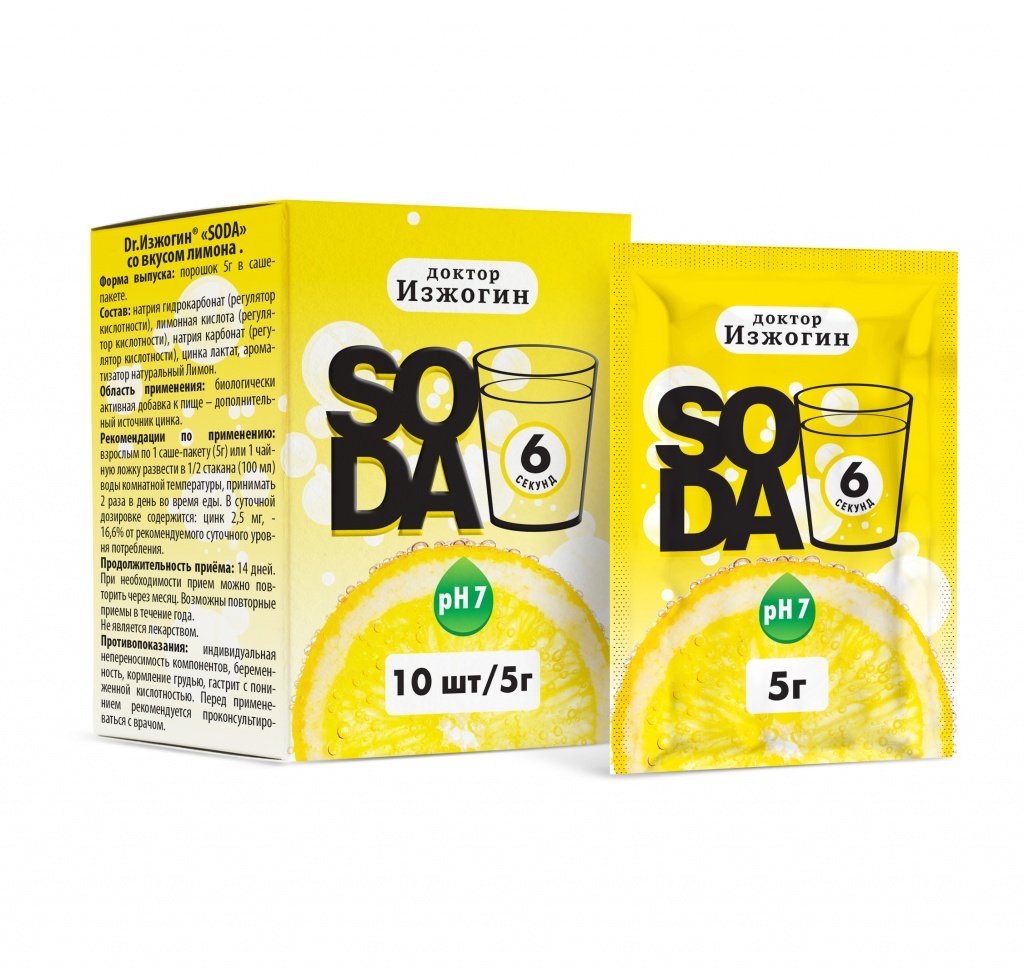 От изжоги. SODA со вкусом лимона в удобном саше-формате оказывает антацидное, абсорбирующее и обволакивающее действие, способствует снижают интенсивность выработки соляной кислоты, надежно избавляя от... Показать описание изжоги. Форма выпуска: саше 5г №10 Продолжительность приёма: 14 дней. При необходимости прием можно повторить через месяц. Возможны повторные приемы в течение года. Противопоказания: индивидуальная непереносимость компонентов, беременность, кормление грудью, гастрит с пониженной кислотностью. Перед применением рекомендуется проконсультироваться с врачом. СОСТАВ: натрия гидрокарбонат (регулятор кислотности), лимонная кислота (регулятор кислотности), натрия карбонат (регулятор кислотности), цинка лактат, ароматизатор натуральный Лимон. СПОСОБ ПРИМЕНЕНИЯ: взрослым по 1 саше-пакету (5 г) или 1 чайную ложку развести в 1/2 стакана (100 мл) воды комнатной температуры, принимать 2 раза в день во время еды.