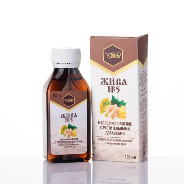 Масло с прополисом и растительными добавками «ЖИВА №5» представляет собой комплекс растительных масел, жирорастворимых витаминов и флавоноидов, применяемый как нелекарственное восстановительное и оздо... Показать описаниеровительное средство для уничтожения паразитов в различных стадиях их развития. В основу продукта положены народные рецепты использования целительных свойств деревьев и трав, соединенные и усиленные замечательными свойствами прополиса. Биологически активные вещества продуктов пчеловодства и растительных компонентов прополисного масла оказывают антипаразитарное и кровоочистительное действие, уничтожают паразитов в различных стадиях их развития (избавляет кровь, кишечник, печень и весь организм от паразитов и их личинок), очищают организм (активно выводят шлаки, канцерогены, токсины, очищают кровь от продуктов распада опухолей и жизнедеятельности паразитов), стимулируют обменные процессы, укрепляют иммунитет, способствуют восстановлению устойчивости организма человека к глистным инвазиям, укрепляют иммунную систему, повышают защитные свойства организма в отношении бактериальных и вирусных заболеваний. Полезно при кишечных инфекциях, глистных инвазиях, резидуальных остаточных проявлениях паразитов; аллергических заболеваниях (пищевой, лекарственной); дерматологии (экзема, псориаз, нейродермит); интоксикации и зашлакованности организма. Являются источником природных антиоксидантов, флавоноидов, полифенольных соединений, содержат дубильные вещества, витамины, макро- и микроэлементы. В состав масла входят: прополис, оливковое масло, масло виноградной косточки, масло черного тмина, тыквенное масло, гвоздичное масло, масляные экстракты корня аира (болотного), имбиря, кардамона, календулы, куркумы, базилика, пижмы. Прополис является самым сильным природным антибиотиком. Общеизвестно, что бактерии и вирусы мутируют, приспосабливаются к любому лекарству. Со временем они приобретают генетический код антибиотика, и лекарство становится для них пищей. Однако, нет таких бактерий, которые смогли бы подстроиться под прополис. Прополис обладает антисептическими свойствами. Он уничтожает бактерии, вирусы и грибки. Кроме того, прополис является сильным противовоспалительным, кровоостанавливающим, регенерирующим, противолучевым, тонизирующим, иммуностимулирующим, ранозаживляющим, обезболивающим и укрепляющим веществом, а также источником целого спектра биологически полезных натуральных элементов. Свойства прополиса обусловлены наличием в его составе более 200 различных веществ, благотворно влияющих на человеческий организм – практически полный состав необходимых человеку микроэлементов, флавоноидов, экстраминов, энзимов, масел, аминокислот и жирных кислот. Входящие в состав прополиса флавоноиды оказывают противовоспалительное воздействие на слизистые оболочки. Они позволяют укрепить соединительные ткани и сосуды, предотвратить распад экстрамина. Антитоксичное действие экстракта прополиса имеет важное значение при различных инфекционных заболеваниях, которые сопровождаются яркой интоксикацией организма. Оливковое масло включает в себя множество витаминов и микроэлементов, жирных кислот (Омега-6, олеиновую, пальмитиновую и т.д.), благодаря которым считается незаменимым компонен