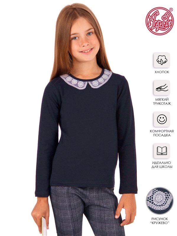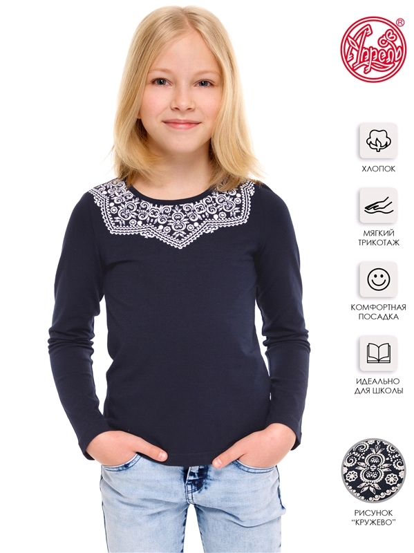 Состав: кулир с лайкрой / хлопок 92% + лайкра 8%. Лонгслив для девочки выполнен из легкого хлопкового полотна с лайкрой. Изделие с длинными рукавами, декорировано печатью, имитирующей кружевной воротн... Показать описаниеичок. Незаменимый предмет гардероба для школьниц! Уход: только машинная стирка (руками не стирать!) при температуре 40 градусов, без предварительного замачивания. Изделия с печатью и декором перед стиркой необходимо вывернуть на изнаночную сторону.