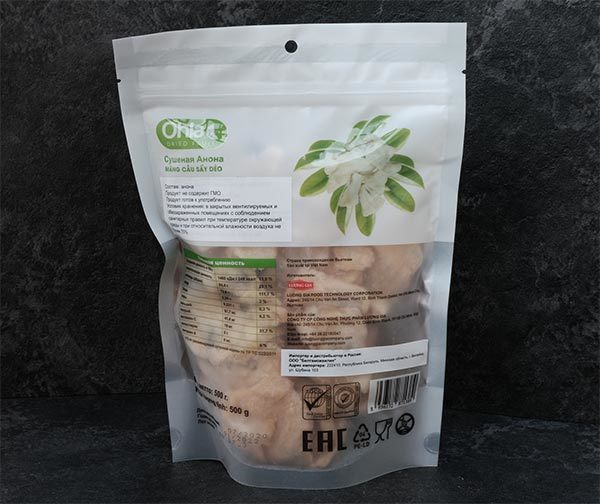 Масса нетто в г,: 500.Страна происхождения: Вьетнам.Производитель: Ohla.Состав: Анона сушеная 100% натуральный продукт, не содержит ГМО.Срок хранения: 12 месяцев.Условия хранения: при температуре от 0... Показать описание до 18 г по Ц , открытую упаковку держать в холодильнике.Энергетическая ценность на 100 г,: 348 кКал.Белки, г,: 2,25.Углеводы, г,: 84,4.Жиры, г: 0,221