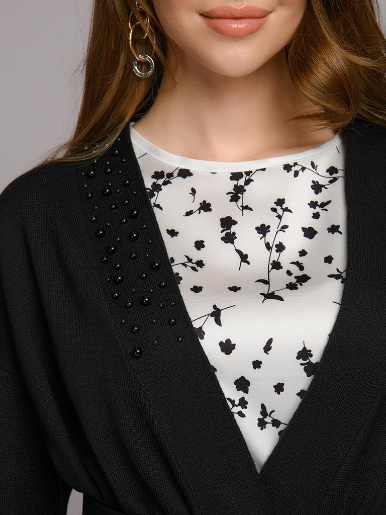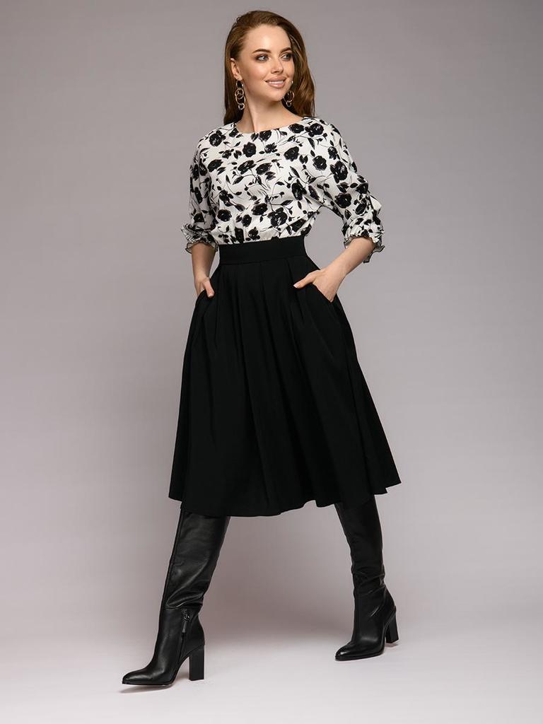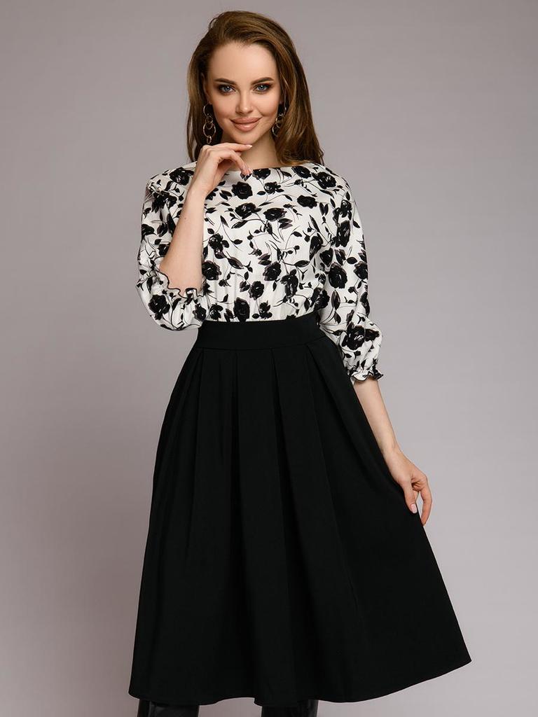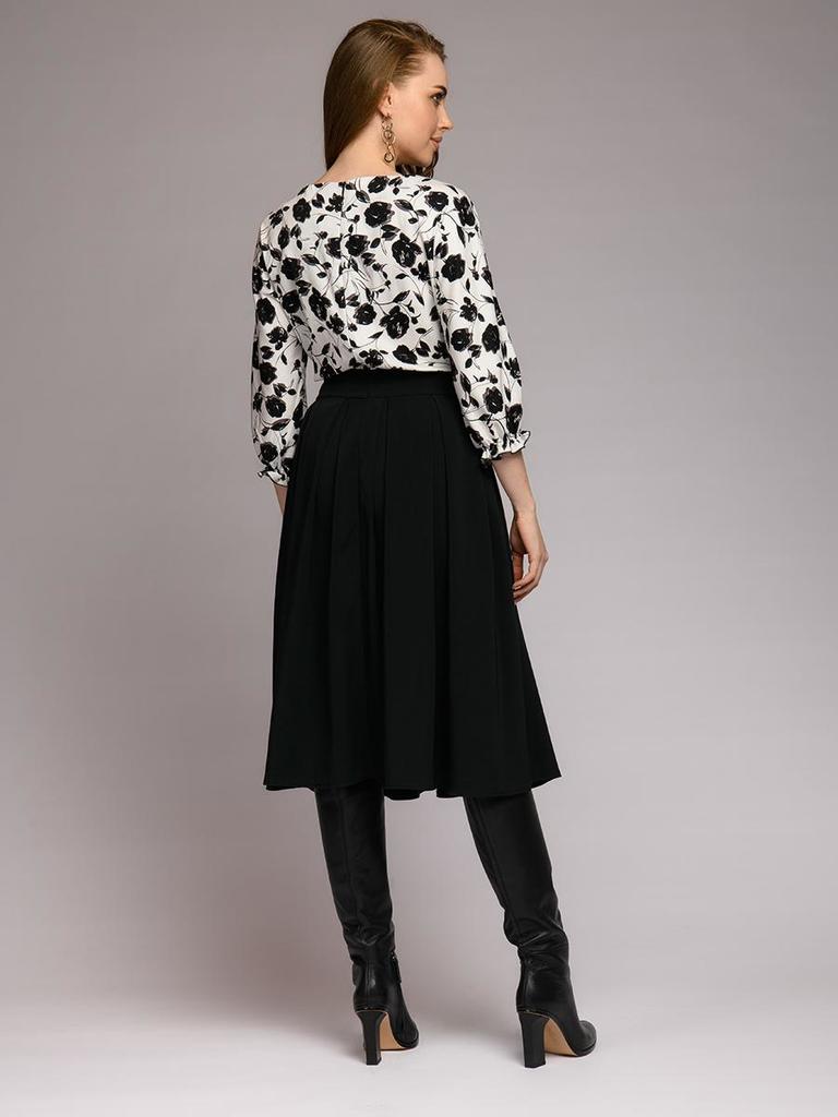 Цвет: белый (принт) - черный. Ткань: костюмная - плательная. Длина рукава: 50 см. Длина по спинке: 115 см. Состав: Состав верха: 95% Хлопок, 5% Эластан. Состав низа: 96% Полиэстер, 4% Эластан Комплект... Показать описаниеация: платье. Уход: сухая чистка. Сезон: весна allsize: 40,42,44,46,48. Длина рукава (определение): 3-4. Категория: повседневные платья. Прилегание: полуприлегающее. Горловина: без воротника. Принт: двух (трех) цветное. Спинка: закрытая. Тип карманов: в шве Страна производства: Россия. По назначению: повседневное Вид застежки: молния. Юбка: складки Платье сочетает в себе белый принтованный верх и черную пышную юбку-солнце. Прекрасно подойдет тем, кто хочет разнообразит свой деловой гардероб.