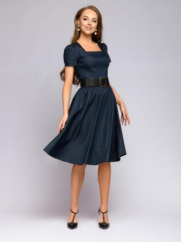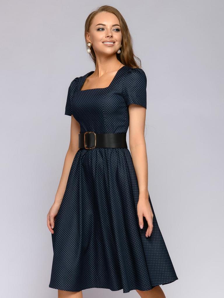 Цвет: темно-синий (принт). Ткань: плательная. Длина по спинке: 106 см. Состав: 65% хлопок, 32% полиэстер, 3% эластан Комплектация: платье; ремень в комплект не входит. Уход: деликатная машинная стирка... Показать описание при 30 градусах. Сезон: осень allsize: 40,42,44,46,48. Длина рукава (определение): короткий. Категория: повседневные платья. Прилегание: полуприлегающее. Горловина: прямоугольный вырез. Принт: мелкий принт. Спинка: закрытая. Страна производства: Россия. По назначению: повседневное. Юбка: присборенная ¶Модель выполнена из плательной ткани темно-синего цвета в мелкий горошек в стиле «ретро». Вырез горловины типа «каре». Акцент на талии достигается благодаря сочетанию прилегающего верха и пышной юбки длины миди.