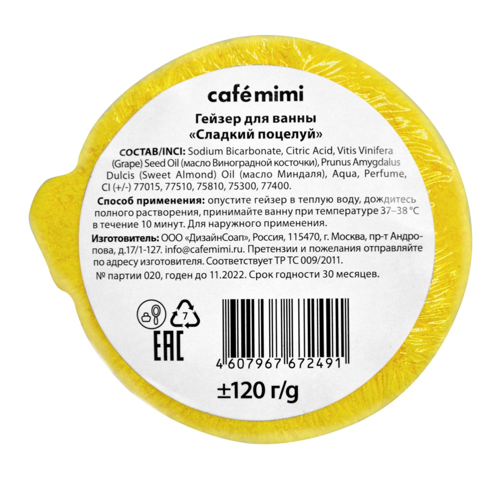 Гейзер для ванны – это ароматное шипучее средство для принятия ванны и для ухода за кожей. Ванная комната наполняется сладким ароматом фруктов и ягод, придавая бодрость и поднимая настроение. Такие во... Показать описаниедные процедуры очень любят и дети. Наблюдать, как гейзер шипит и растворяется,  выделяя огромное количество маленьких пузырьков – одно удовольствие! Состав: Sodium Bicarbonate, Citric Acid, Vitis Vinifera (Grape) Seed Oil (масло Виноградной косточки), Prunus Amygdalus Dulcis (Sweet Almond) Oil (масло Миндаля), Aqua, Perfume, CI 77015, 75300, 75810 Применение: Опустите гейзер в теплую воду, дождитесь полного растворения, принимайте ванну при температуре 37-38° С в течение 10 минут. Для наружного применения. Срок годности 30 месяцев.