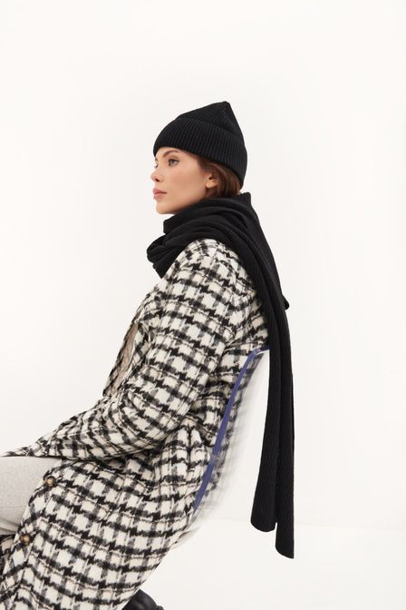 Совет стилиста: Елена, стилист «Для образа на каждый день сочетайте шарф с облегающим джемпером, джинсами-скинни, коротким пуховиком и ботинками на платформе». Однотонный шарф от TOPTOP сделан из смес... Показать описаниеовой шерсти – мягкого, прочного, приятного к телу материала, который сохраняет форму и цвет при долговременной носке. Аксессуар выполнен в универсальном черном цвете. Артикул: 2000410516243 . Детали: – Собственный бренд TOPTOP.RU; – Производство: Россия; – Дизайн: Санкт-Петербург, Россия; – Универсальный черный цвет; – Минималистичный дизайн; – Фактурная ткань в рубчик; – В составе: 50% шерсть, 50% ПАН – теплый, прочный, износостойкий материал, который не требует специального ухода и хорошо держит форму. Образ Образ дополнен Длинное пальто-рубашка с принтом «гусиная лапка» TOPTOP