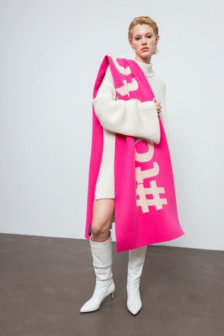 Совет стилиста: Артём, стилист «Шарф может стать ярким акцентом casual-лука – сочетайте его с молочным пуховиком, белыми ботинками на платформе, бежевыми джинсами и свитером». Длинный широкий шарф от ... Показать описаниеTOPTOP STUDIO выполнен в оттенке розовой фуксии – актуальном цвете сезона FW’20/21 по версии Vogue. Аксессуар декорирован контрастным принтом #toptopgirls. Артикул: 2000410521278 . Детали: – Собственный бренд TOPTOP.RU; – Дизайн: Санкт-Петербург, Россия; – Все оттенки фуксии – тренд FW’20/21 по версии Vogue; – Контрастный принт-надпись #toptopgirls; – В составе: 65% акрил, 35% нейлон – легкий, прочный, износостойкий материал, который не деформируется и не теряет цвет при длительной носке; – Производство: КНР. Образ Образ дополнен Oversize-свитер из смесовой шерсти с широкими рукавами TOPTOP STUDIO