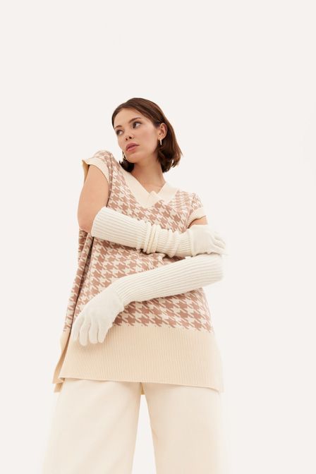 Совет стилиста: Елена, стилист «Для повседневного лука сочетайте перчатки с трикотажным топом без рукавов, практичными брюками из джинсовой ткани, укороченным пуховиком и ботинками на платформе». Длин... Показать описаниеные перчатки – один из главных трендов FW’20/21 по версии Buro 24/7. Трикотажная модель в крупный рубчик от TOPTOP выполнена из смесовой шерсти. Это прочный, износостойкий материал, который хорошо сохраняет тепло. Артикул: 2000410516298 . Детали: – Собственный бренд TOPTOP.RU; – Производство: Россия; – Дизайн: Санкт-Петербург, Россия; – Длинные перчатки – тренд FW’20/21 по версии Buro 24/7; – Нейтральный бежевый оттенок; – Фактурная ткань в рубчик; – В составе: 50% шерсть, 50% ПАН – теплый, прочный, износостойкий материал, который не требует специального ухода и хорошо держит форму. Образ Образ дополнен Плиссированная юбка кожаной фактуры с поясом H.I.T.