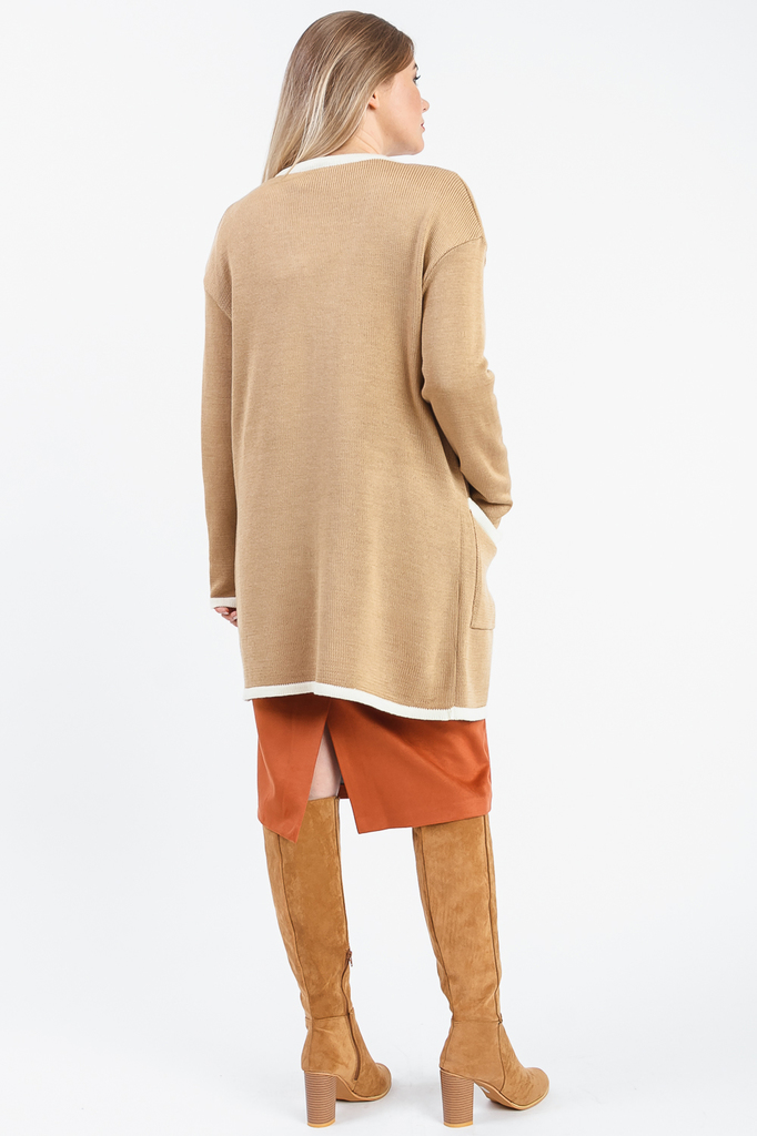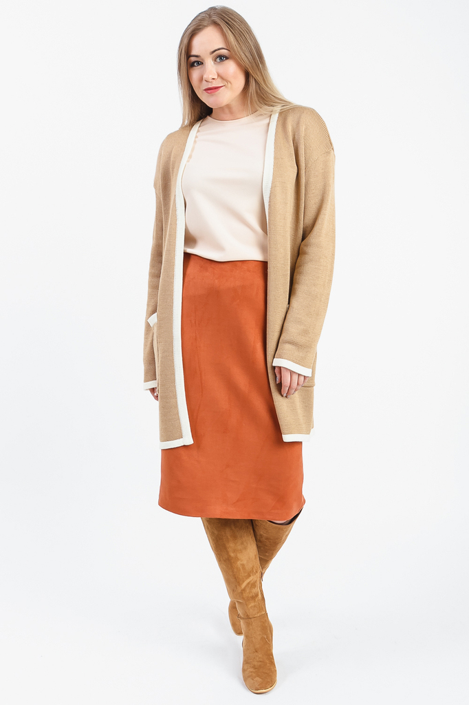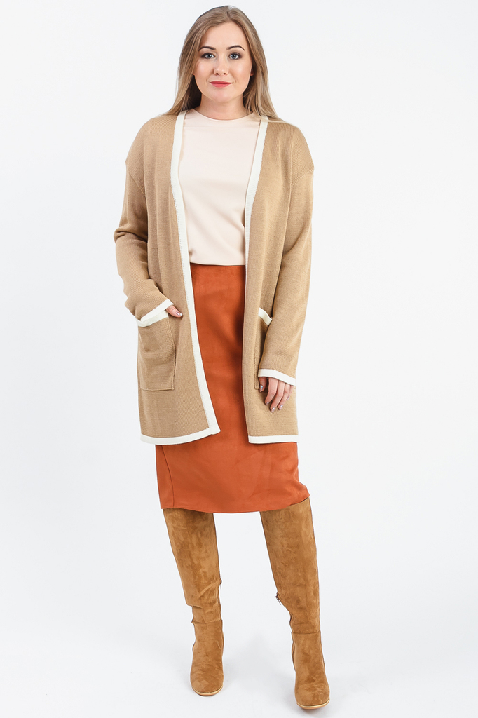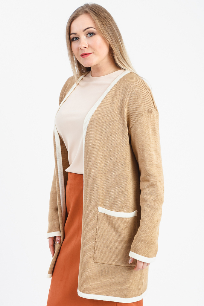 Женственный кардиган из мягкой пряжи позволяет совместить стиль и комфорт. Такой кардиган обязательно придется "по вкусу" ценительницам нежного и прекрасного. Кардиган прямого силуэта с накладными кар... Показать описаниеманами по переду и съемным поясом. Край борта и карманов обработан контрастной бейкой. В изделии использованы цвета: песочный. Длина рукава - 60 ± 1 см Длина изделия - 79 ± 2 см Параметры девушки-фотомодели: Рост - 166 см Размер - 46-48 Обхват груди - 93 ± 1 см Обхват талии - 69 ± 1 см Обхват бёдер - 101 ± 1 см Длина переда до талии - 44 ± 1 см Длина спины до талии - 42 ± 1 см Длина руки - 59 ± 1 см