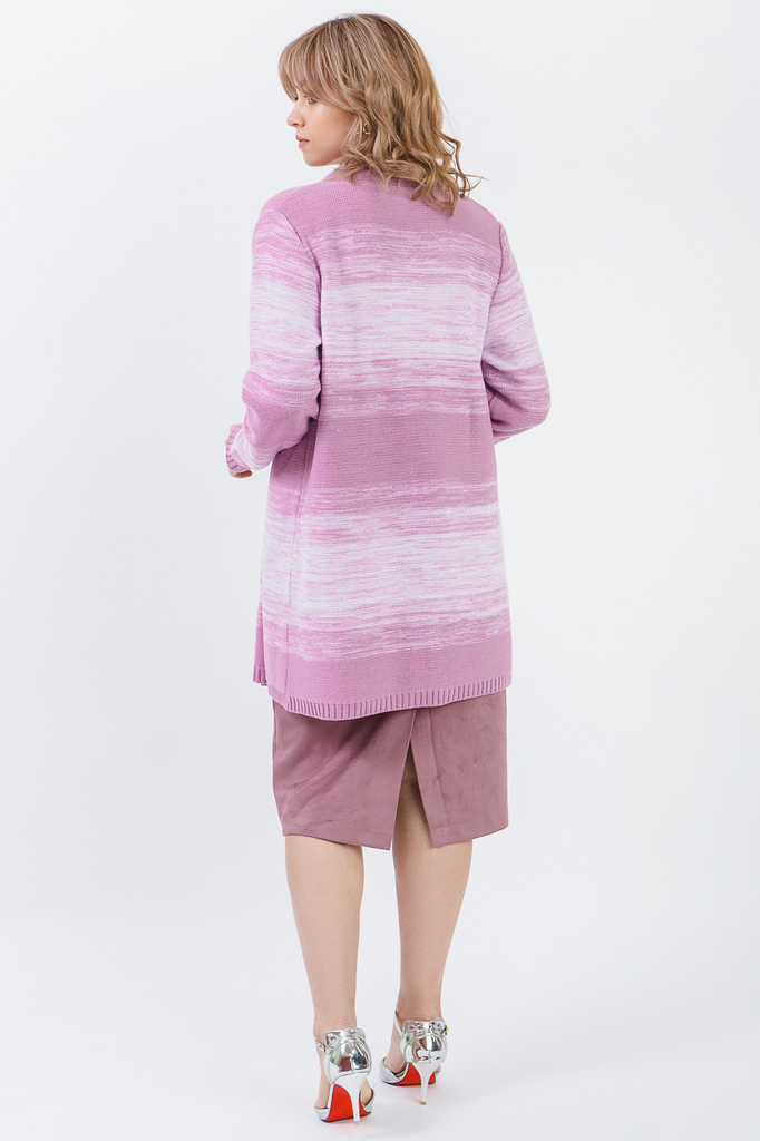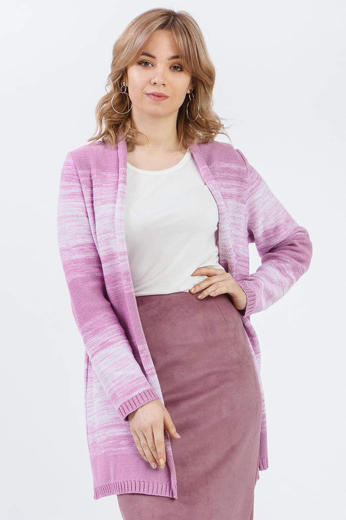 При создании образа, который Вы видите на фотографии, также была использована замшевая юбка арт. U0517. Для просмотра модели введите артикул в строке поиска. Кардиган прямого силуэта без застежки. Кра... Показать описанией борта вывязанный, не обработан. Воротник "шалевый". Рукав втачной, длинный. В изделии использованы цвета: сиреневый, белый. Длина рукава - 60 ± 1 см Длина изделия - 75 ± 2 см Параметры девушки-фотомодели: Рост - 166 см Размер - 46-48 Обхват груди - 93 ± 1 см Обхват талии - 69 ± 1 см Обхват бёдер - 101 ± 1 см Длина переда до талии - 44 ± 1 см Длина спины до талии - 42 ± 1 см Длина руки - 59 ± 1 см