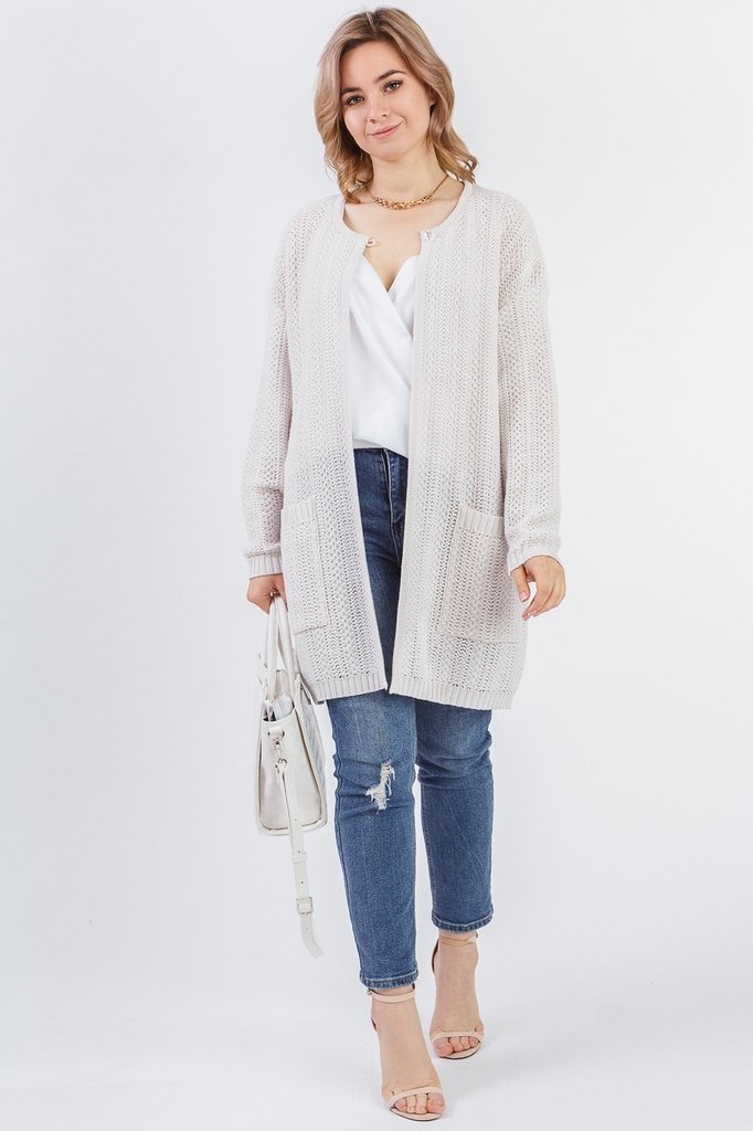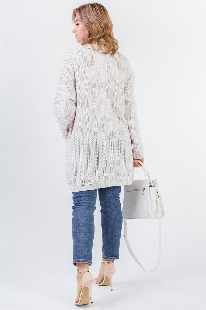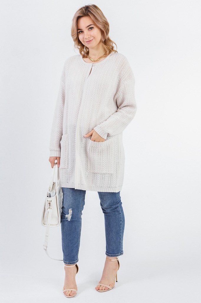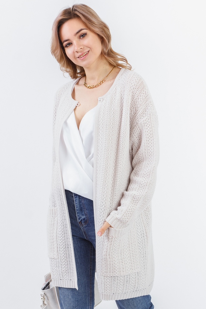 Нежный вязаный кардиган. Модель выполнена из пряжи. Вязаная одежда всегда актуальна, отличается комфортом и практичностью. Изделия из пряжи займут достойное место в Вашем гардеробе и станут прекрасной... Показать описание основой для стильных образов. Кардиган прямого - свободного силуэта. Горловина и края бортов обработаны узкой бейкой. Рукава длинные, со спущенной линией плеча. По низу рукава - резинка. На полочках - накладные карманы. Застежка на горловине - 1 пуговица с навесной петлей. В изделии использованы цвета: бежевый. Длина рукава (от конечной плечевой точки) - 60 ± 1 см Длина изделия - 80 ± 2 см Параметры девушки-фотомодели: Рост - 166 см Размер - 46-48 Обхват груди - 93 ± 1 см Обхват талии - 69 ± 1 см Обхват бёдер - 101 ± 1 см Длина переда до талии - 44 ± 1 см Длина спины до талии - 42 ± 1 см Длина руки - 59 ± 1 см