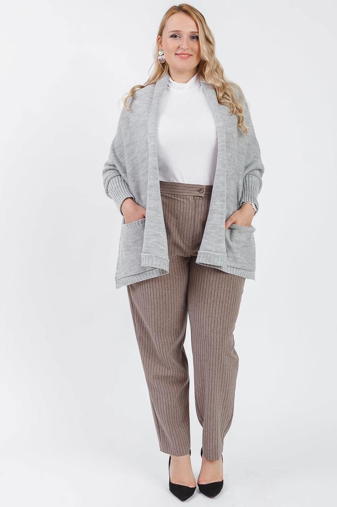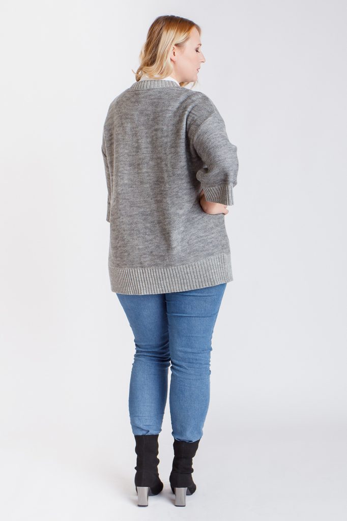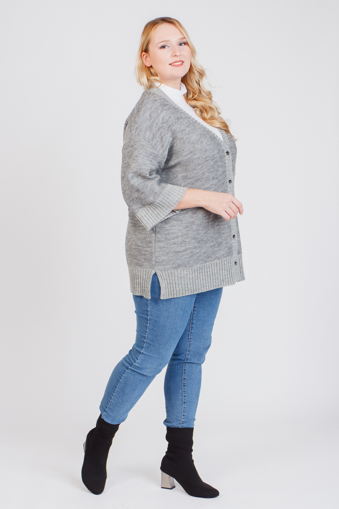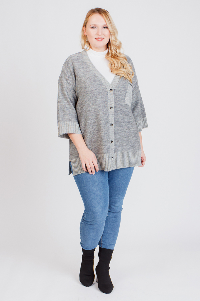 Женственный кардиган. Модель выполнена из пряжи. Вязаная одежда всегда актуальна, отличается комфортом и практичностью. Изделия из пряжи займут достойное место в Вашем гардеробе и станут прекрасной ос... Показать описаниеновой для стильных образов. Кардиган "оверсайз" прямого силуэта с разрезами по боковым швам. На передней части изделия застежка на пуговицы и накладной карман на груди. Горловина и борта обработаны бейками. Рукав рубашечный, 3/4, со спущенной линией плеча. В изделии использованы цвета: серый и др. Длина рукава (от конечной плечевой точки) - 42 ± 1 см Длина изделия: 46 размер - 70 ± 2 см 48 размер - 70 ± 2 см 50 размер - 70 ± 2 см 52 размер - 70 ± 2 см 54 размер - 72 ± 2 см 56 размер - 72 ± 2 см 58 размер - 72 ± 2 см Параметры девушки-фотомодели: Рост - 170 см Размер – 52-54 Обхват груди - 106 ± 1 см Обхват талии - 86 ± 1 см Обхват бёдер - 119 ± 1 см Длина переда до талии – 52 ± 1 см Длина спины до талии - 40 ± 1 см