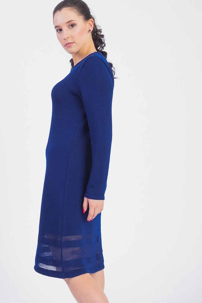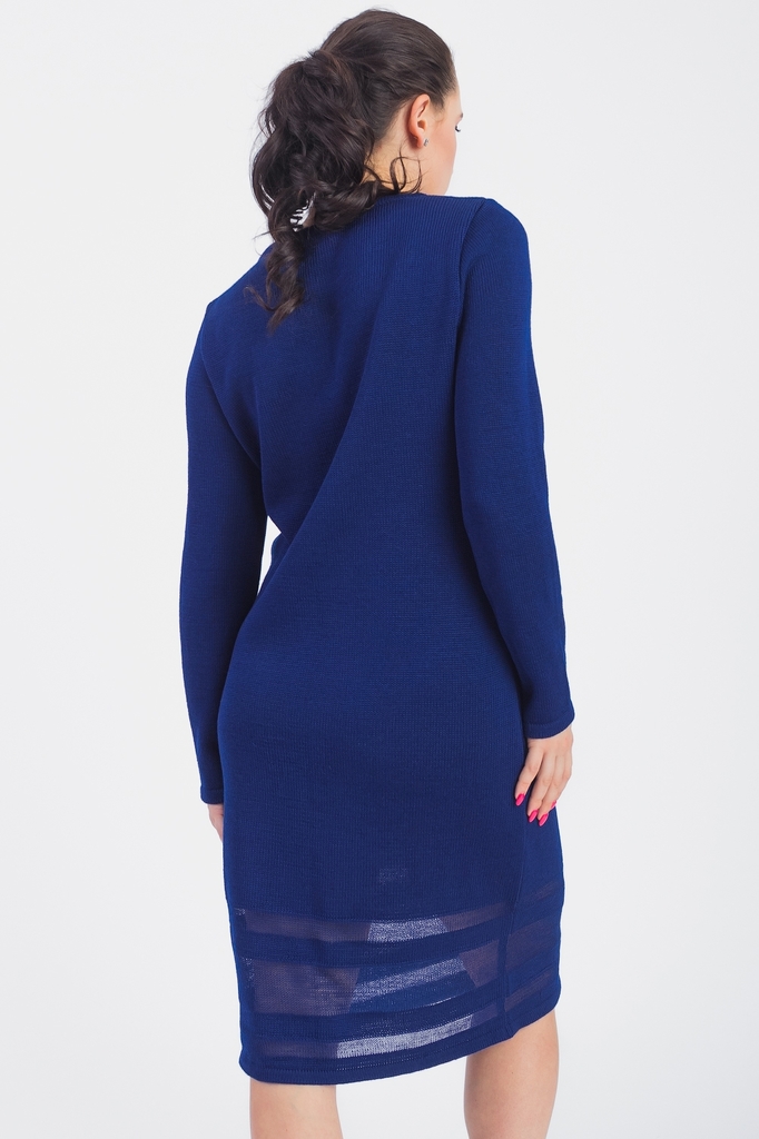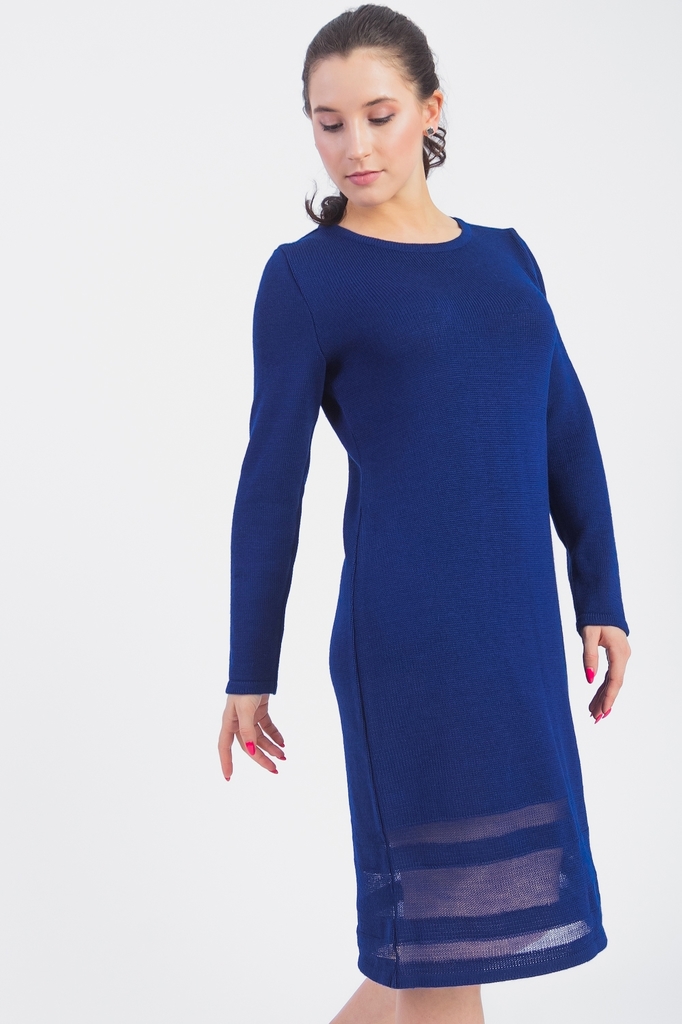 Повседневное женское платье лаконичного дизайна. Модель выполнена из пряжи. Вязаные изделия - это красота, тепло и комфорт. В вязаных вещах очень легко оставаться женственной и в то же время не замёрз... Показать описаниенуть. Платье полуприлегающего силуэта. Горловина круглая обработана бейкой. Рукав втачной, длинный. В изделии использованы цвета: синий Длина рукава - 59 ± 1 см Длина изделия - 110 ± 2 см Параметры девушки-фотомодели: Рост - 169 см Размер - 46 Обхват груди - 92 см ± 1 см Обхват талии - 70 см ± 1 см Обхват бёдер - 102 см ± 1 см