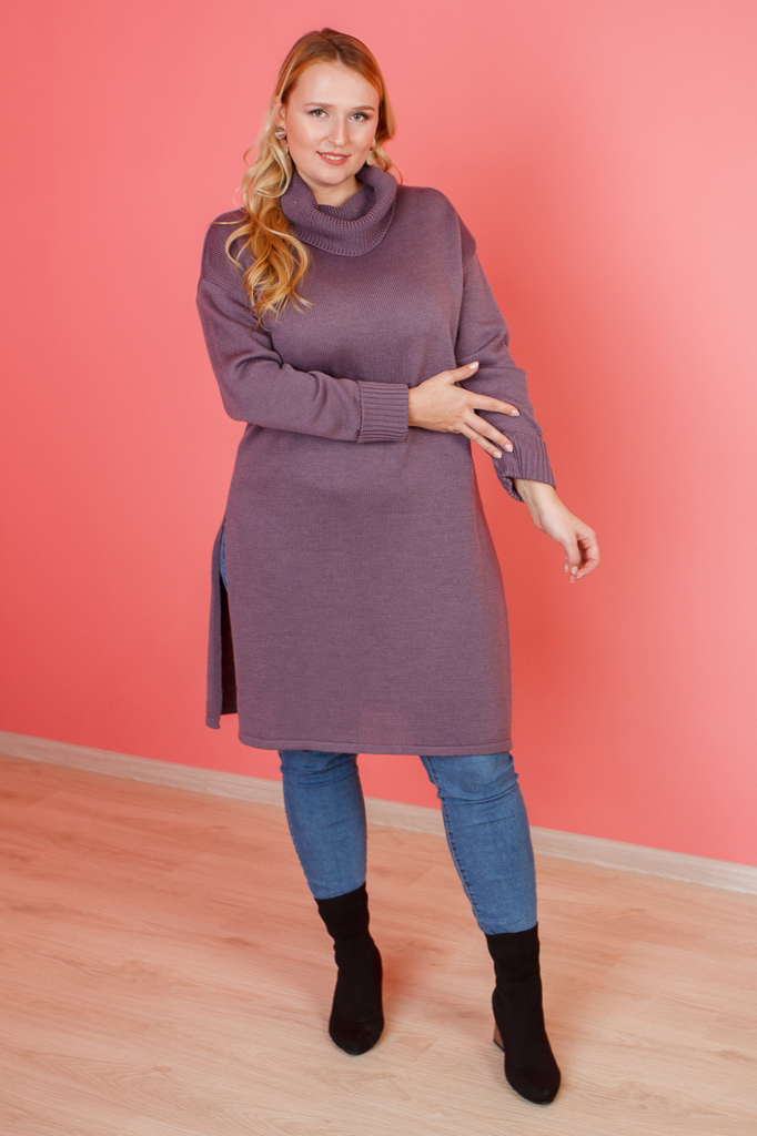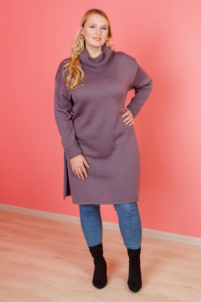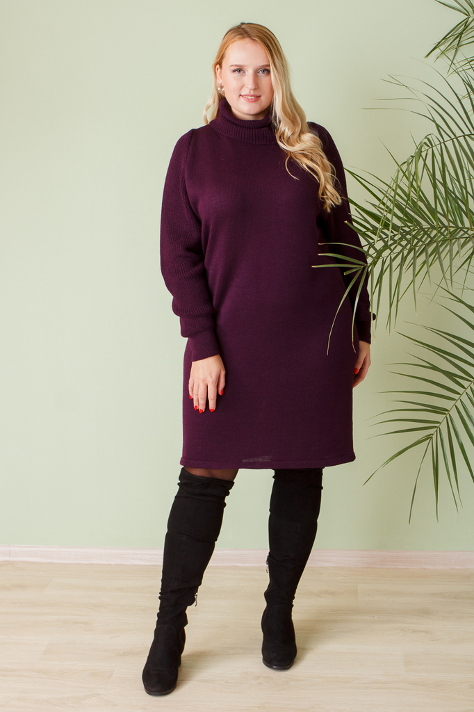 Уютное вязаное платье. Модель выполнена из пряжи. Вязаные изделия - это красота, тепло и комфорт. В вязаных вещах очень легко оставаться женственной и в то же время не замёрзнуть. Платье прямого свобо... Показать описаниедного силуэта. Рукава длинные со спущенной линией плеча. Низ рукавов с манжетой. Горловина "стойка-резинка". В изделии использованы цвета: фиолетовый. Длина рукава (от конечной плечевой точки) - 60 ± 1 см Длина изделия: 46 размер - 103 ± 2 см 48 размер - 103 ± 2 см 50 размер - 103 ± 2 см 52 размер - 103 ± 2 см 54 размер - 105 ± 2 см 56 размер - 105 ± 2 см 58 размер - 105 ± 2 см Параметры девушки-фотомодели: Рост - 170 см Размер – 52-54 Обхват груди - 106 ± 1 см Обхват талии - 86 ± 1 см Обхват бёдер - 119 ± 1 см Длина переда до талии – 52 ± 1 см Длина спины до талии - 40 ± 1 см